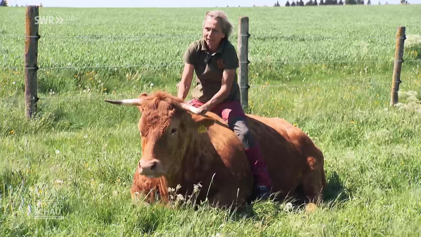 Silke Fischer hat auf ihrem Bauernhof sieben Mutterkühe mit ihren Kälbern, vier Ochsen und einen Bullen. Tiere hautnah spüren sollen – das will sie ihren Gästen mit dem Angebot „Kühe zum Kuscheln“ anbieten. Ihr Bauernhof soll als Lernort auch für Kindergartengruppen und Schulklassen die Achtung vor Lebewesen vermitteln. Im Landesschau-Studio erzählt sie, warum Kühe gut für die Seele sind und wie auch ihr Kühe in schweren Zeiten geholfen haben.