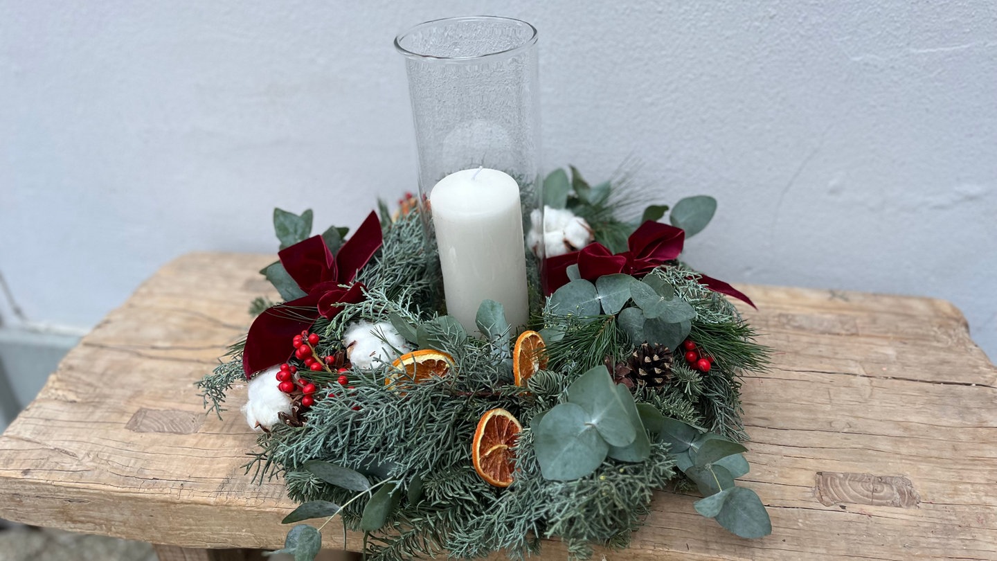 Sehr hübsch und modern sind Advents-Arrangements in der Schale. Besonders geeignet sind Schalen mit einem Sockel. In der Mittel werden vier unterschiedlich hohe und unterschiedlich dicke Kerzen platziert. Drumherum wird Moos verteilt und dann geht es ans Gestalten. Hier dominieren Blumen in Bordeaux und Lila. Aber auch hellrosa Blüten sorgen für eine interessante Optik. Hierfür eignen sich unter anderem Hortensienblüten, violette Christrosen, Mohnkapseln, rosa Erika und Äste des Perrückenstrauchs.
