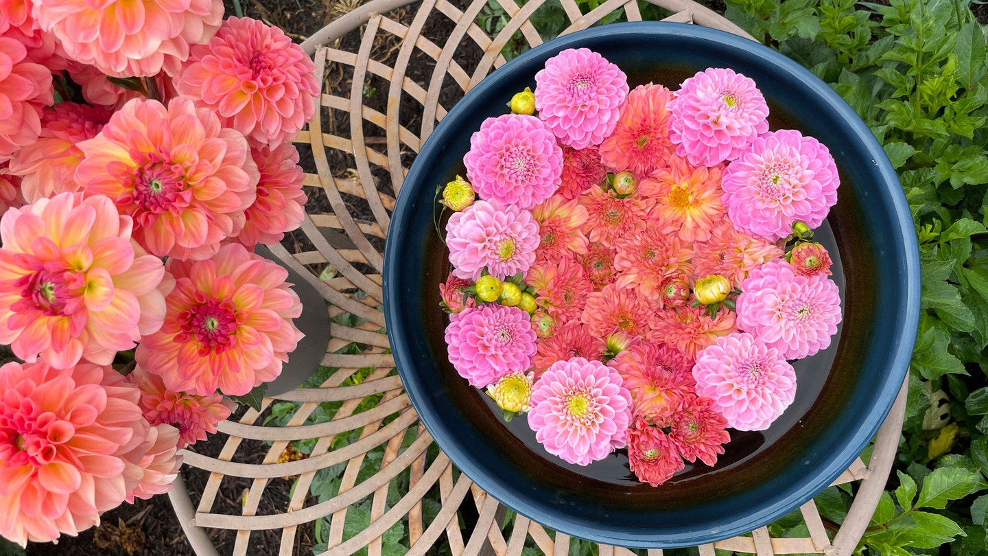- Wenn die Drahtschale vollständig mit Dahlien bedeckt ist, einzelne Knospen zwischenrein stecken.