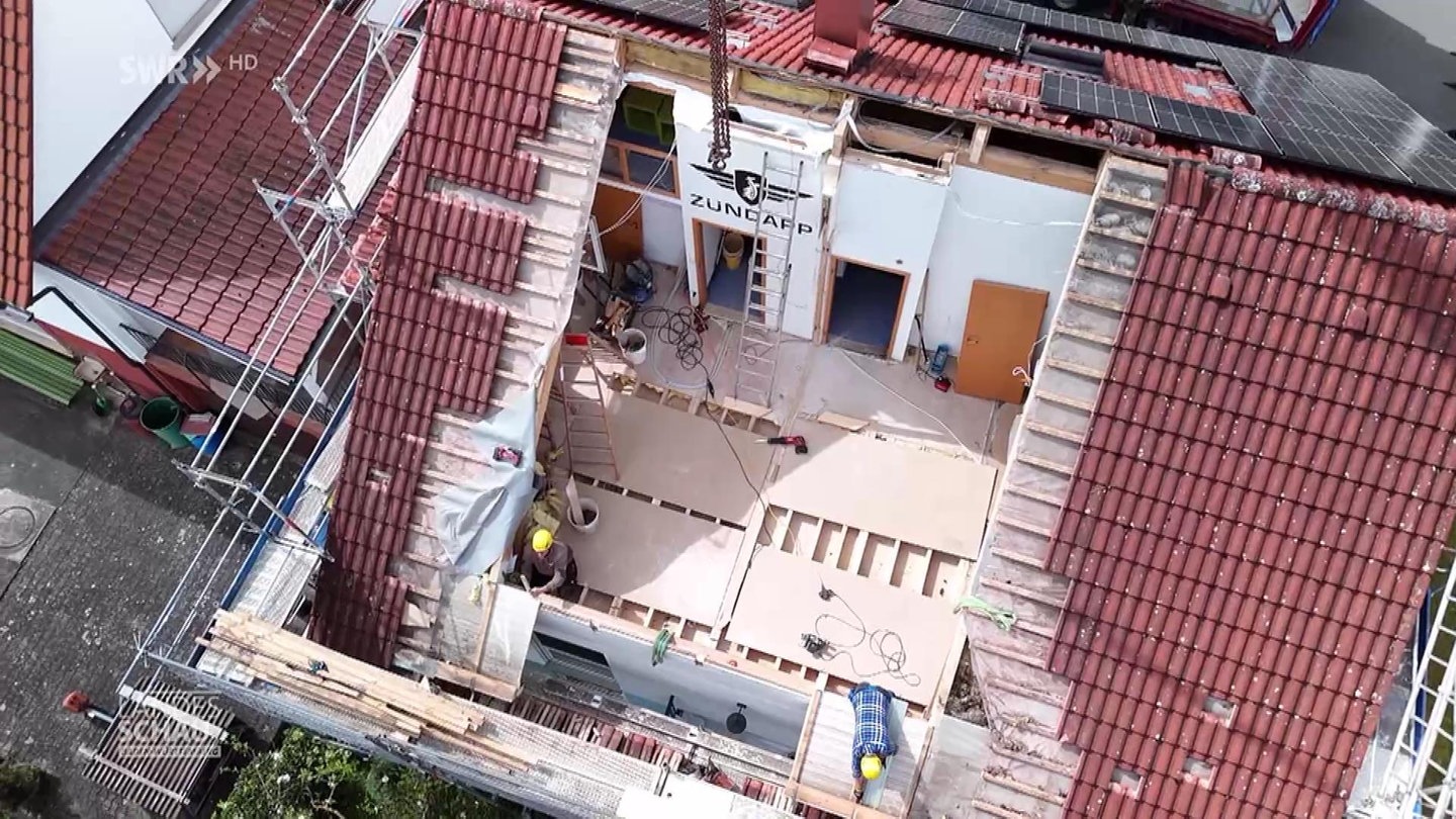 Die Fertighausspezialisten vom schwäbischen Familienunternehmen Schwörer Haus bauen ein 28 Jahre altes Fertighaus in Reutlingen-Altenburg um. Spannende Sache für alle Beteiligten: Im ersten Stock wird die Gaube getauscht. Da muss alles zentimetergenau passen, damit alles dicht ist.