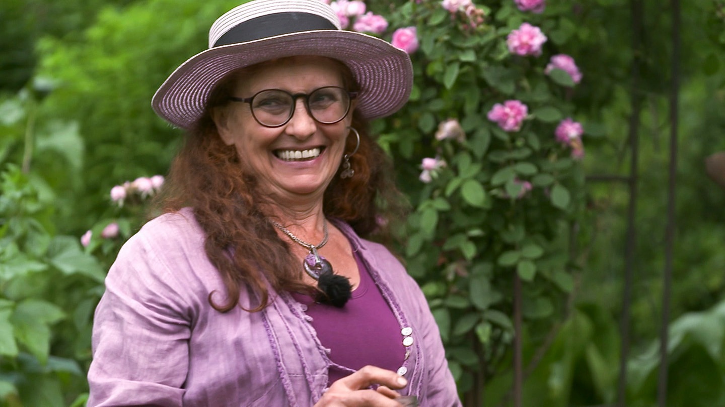 Heilpraktikerin zeigt ihren Wildkräutergarten mit Hoftieren