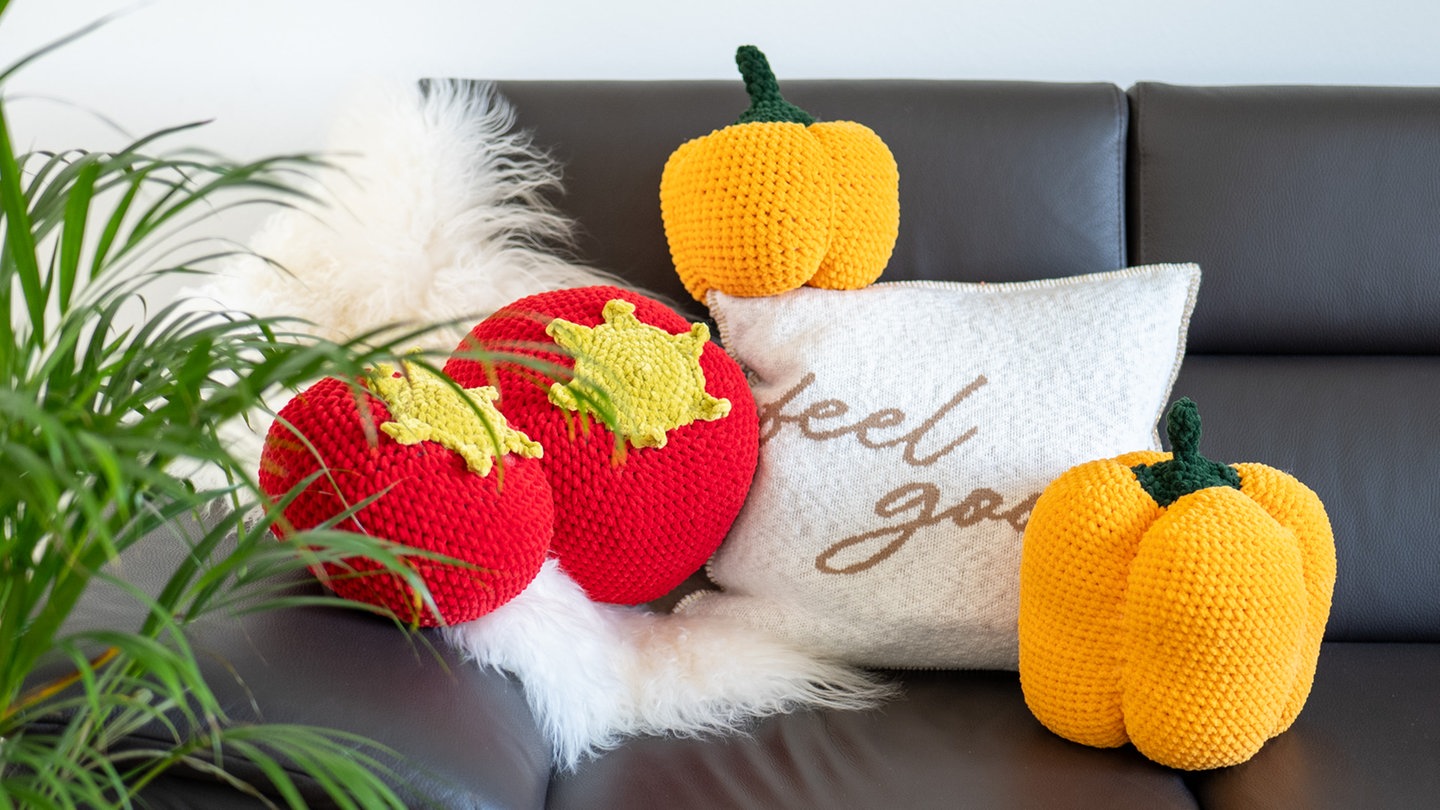 Den Stiel beim Paprikagrün leicht mit Füllwatte ausstopfen. Das Paprikagrün oben auf die Paprika nähen. Damit bekommt der Paprika seinen besonderen Look und es werden die Spannfäden verdeckt. Faden sichern, vernähen und abschneiden.