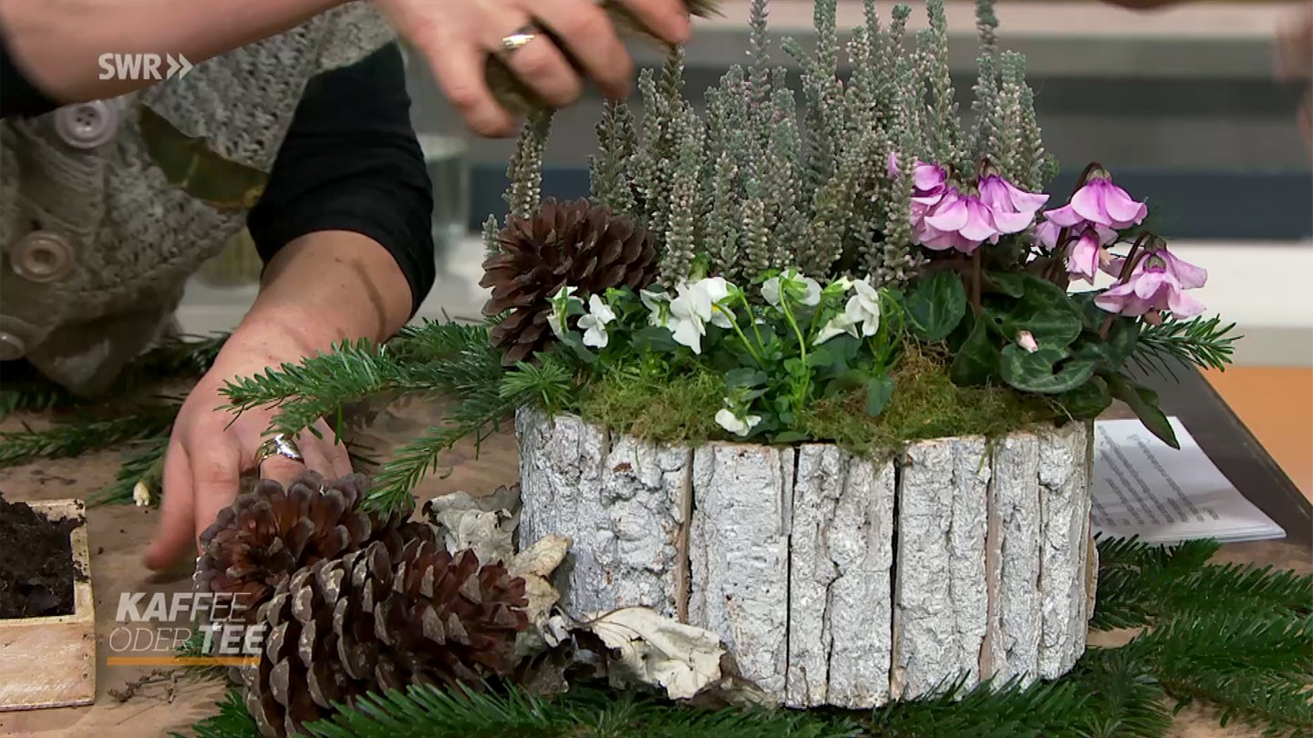 4. Jetzt kann die Schale mit verschiedenen Herbstmaterialien, wie Tannenzapfen, Blätter oder kleinen Ästen dekoriert werden.
