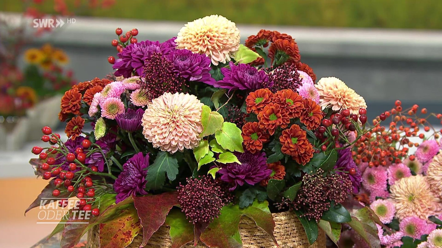 Chrysanthemen stehen für den Herbst. Die bunten Farben und auch die Fülle stellt Floristmeister Nikolaus Hertweck in einem Korb voller Blumen dar.