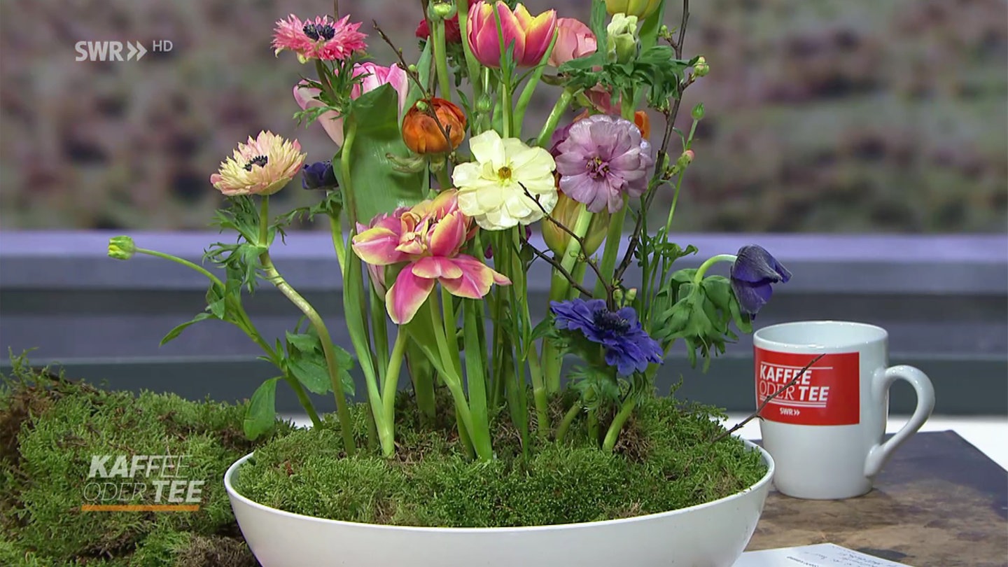 In den Blumenläden steht alles auf Frühling! Floristin Katja Steinhagen kombiniert verschiedene Frühlingsblumen zu einer bunten gesteckten Tischdekoration.