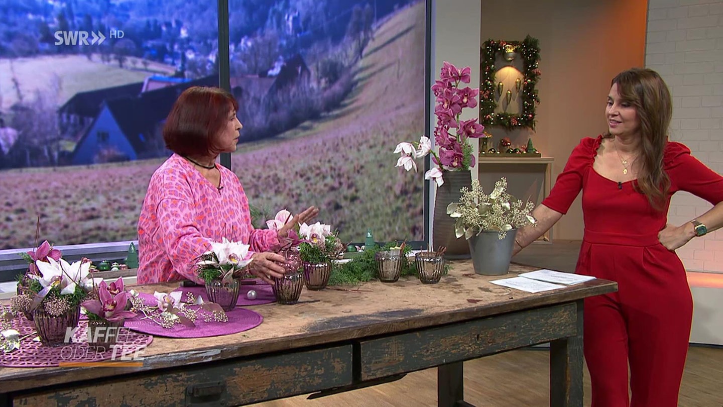 Floristmeisterin Marlen Dürrschnabel bringt die Orchidee weihnachtlich auf den Tisch: Sie kombiniert sie mit Konifere und exotischen Blumen zu einem weihnachtlichen Strauß.