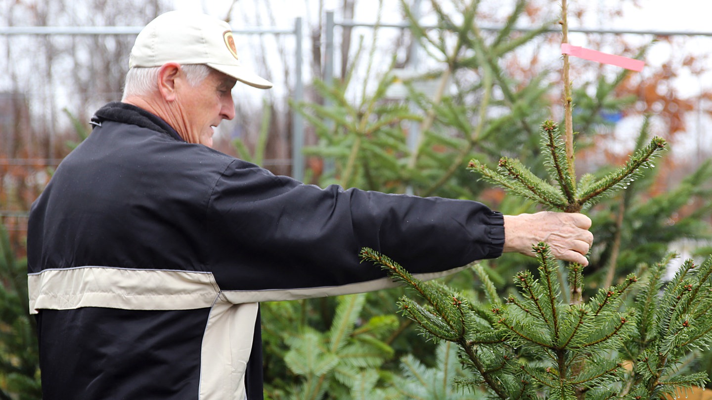Zunächst genau auf die Schnittkante achten. Sie muss vom Harz leicht feucht und hell sein. Je heller die Schnittstelle, desto frischer der Baum. Wer sich hier nicht sicher ist, kann den sogenannten Schütteltest machen. Man schüttelt den Baum ordentlich durch – wenn dabei keine Nadeln abfallen, ist der Baum frisch.