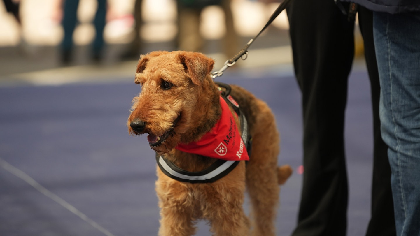 Die Airedale Terrier-Dame Romy hat sich die Bühne im Gläsernen Studio heute genauer angeschaut. Sie ist ein Besuchshund von den Maltesern und dafür in Pflegeeinrichtungen und Altersheimen unterwegs, wo sie mit Kuscheleinheiten und Spielen für Abwechslung sorgt.