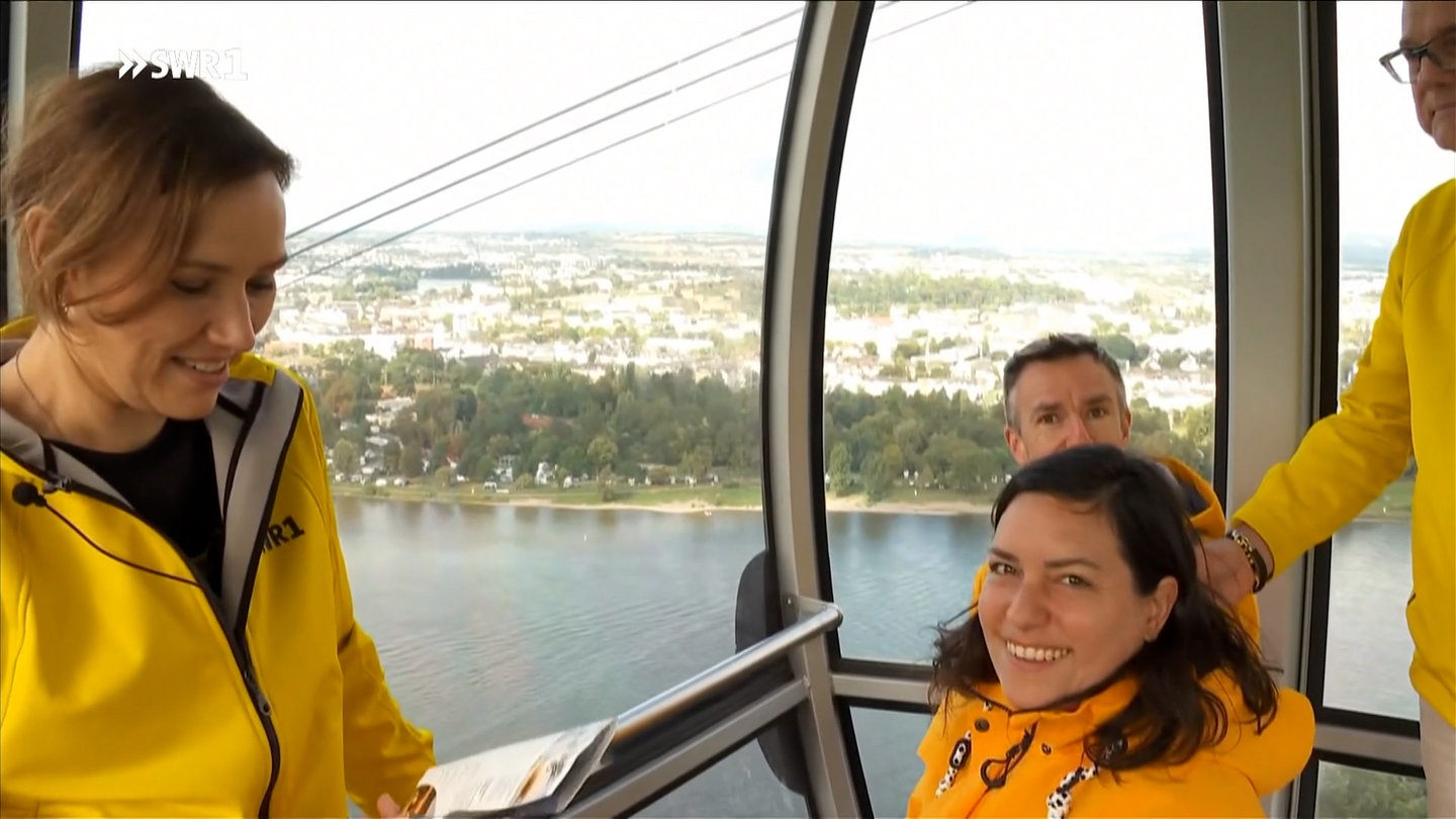 Nachdem Michael und Steffi die Tickets für die Seilbahn in Koblenz kontrolliert haben, sind die beiden selbst auch einmal über den Rhein gegondelt.