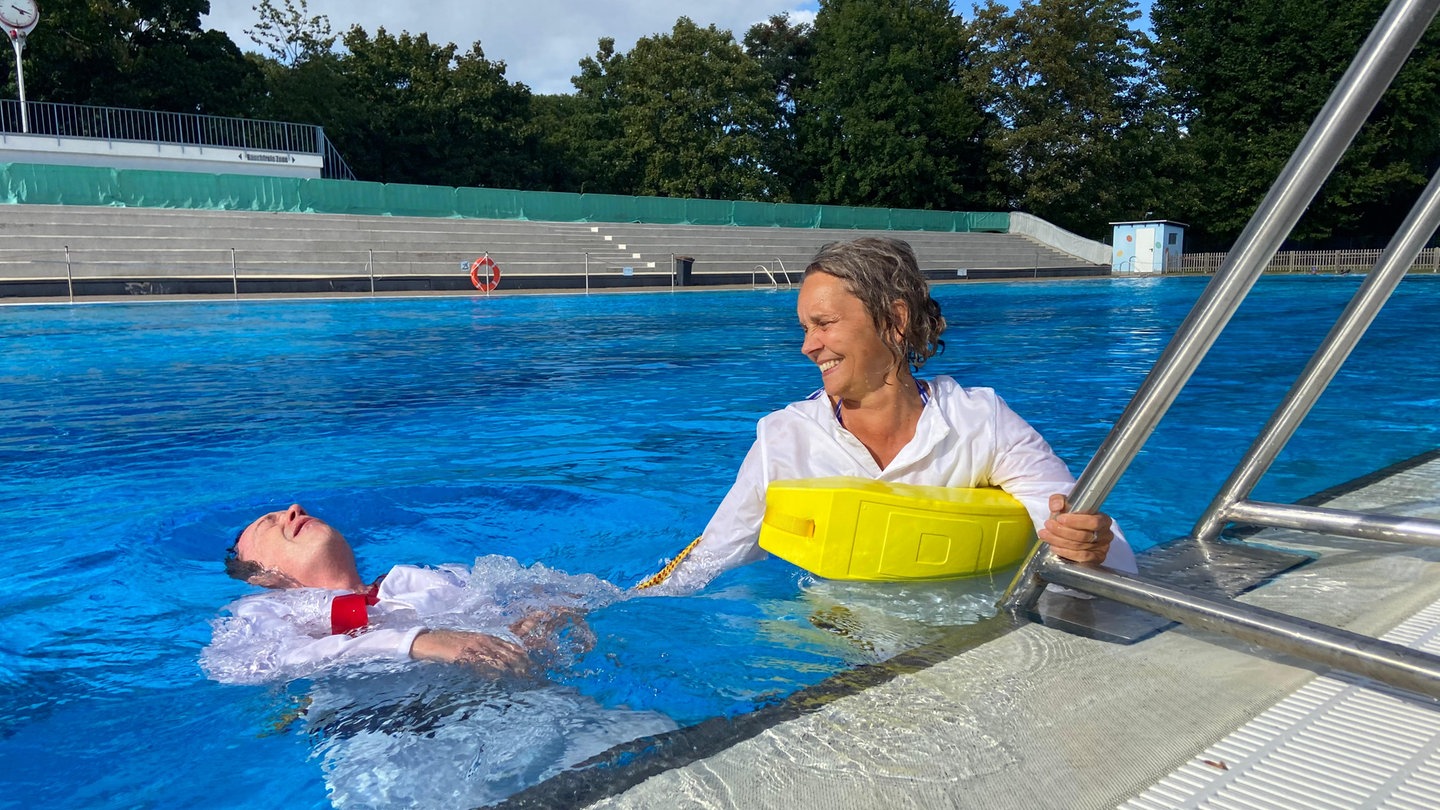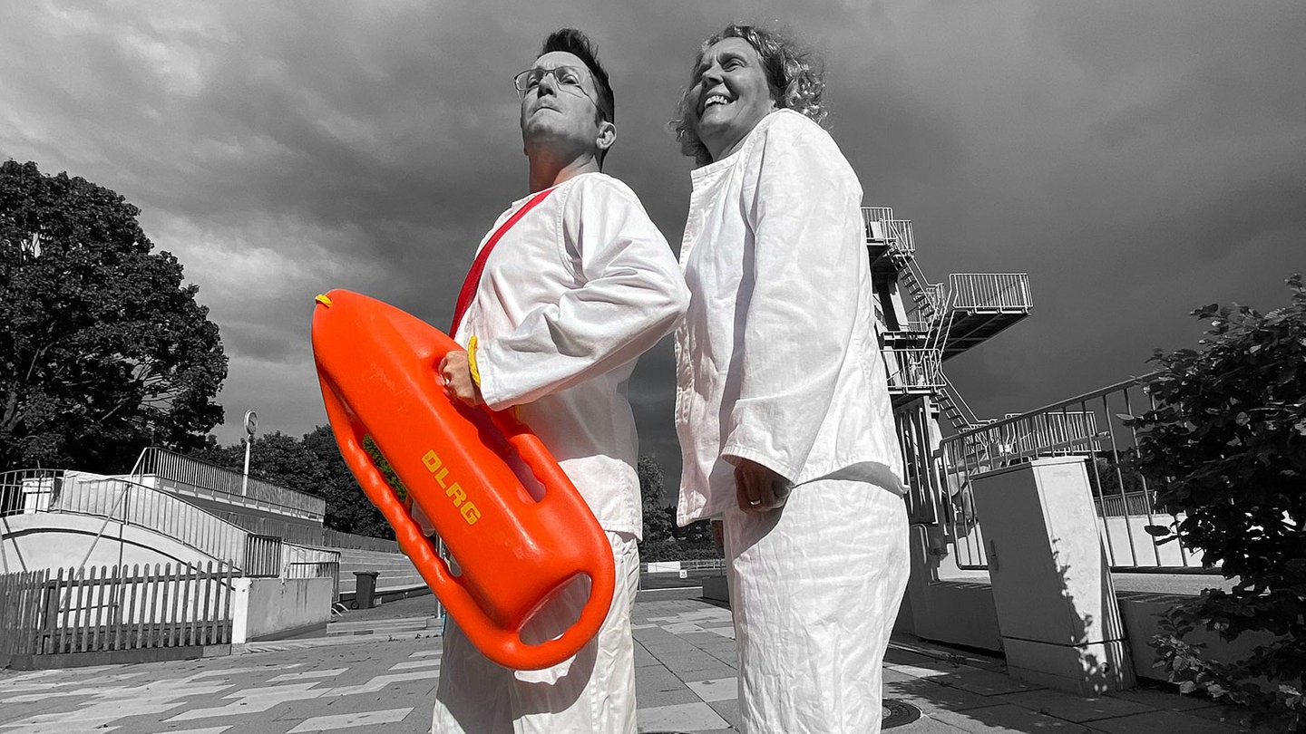 Claudia und Christian lösen ihren Wetteinsatz für die Stadtwette als Mimen bei der DLRG im Freibad Koblenz-Oberwerth ein.