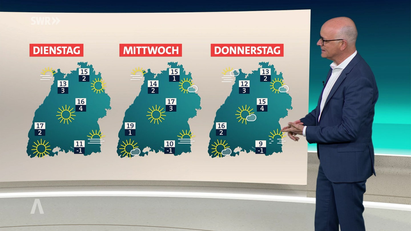 Heute bleibt es überwiegend trocken. Neben dichten Wolken zeigt sich phasenweise die Sonne. Die Temperaturen erreichen maximal 9 Grad auf der Ostalb bis 16 Grad am Oberrhein. Der Südwestwind weht schwach bis mäßig.