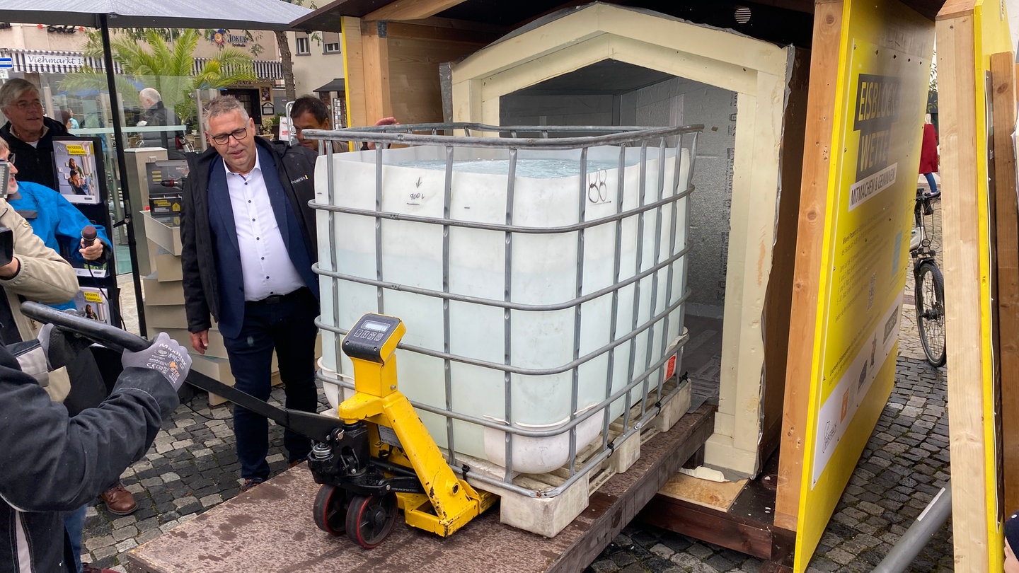 An diesem Samstag wurde der Eisblock aus der Holzhütte geholt. Das Ergebnis: Nur zehn Prozent des Eises sind geschmolzen. Der Eisklotz bringt nun 807 Kilogramm auf die Waage. Das sei ein sehr gutes Ergebnis, sagt der Biberacher Baubürgermeister Christian Kuhlmann (parteilos).