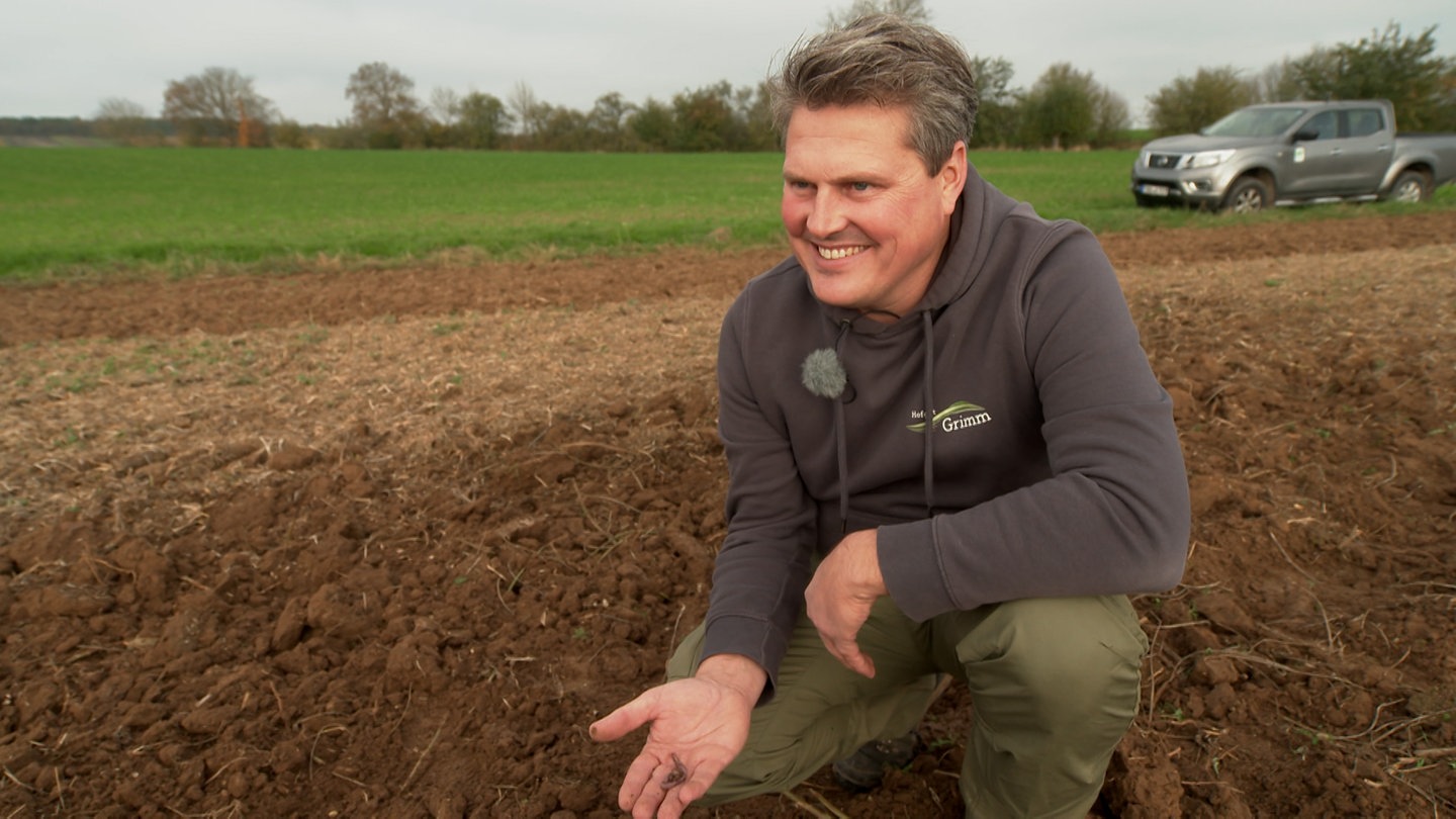 Wenn der Ackerbauer über seine Felder geht, hält er gern nach Regenwürmern Ausschau. "Die sind meine wichtigsten Mitarbeiter", sagte der 45-Jährige, bei einem Besuch des SWR in seinem Betrieb. Die Regenwürmer helfen, die Böden zu lockern und sorgen dafür, dass bei Starkregen das Wasser abfließt, so der studierte Landwirt. "Wenn ich die Kameraden durch zu viel Bodenbearbeitung reduziere, dann mache ich Raubbau an der Natur."