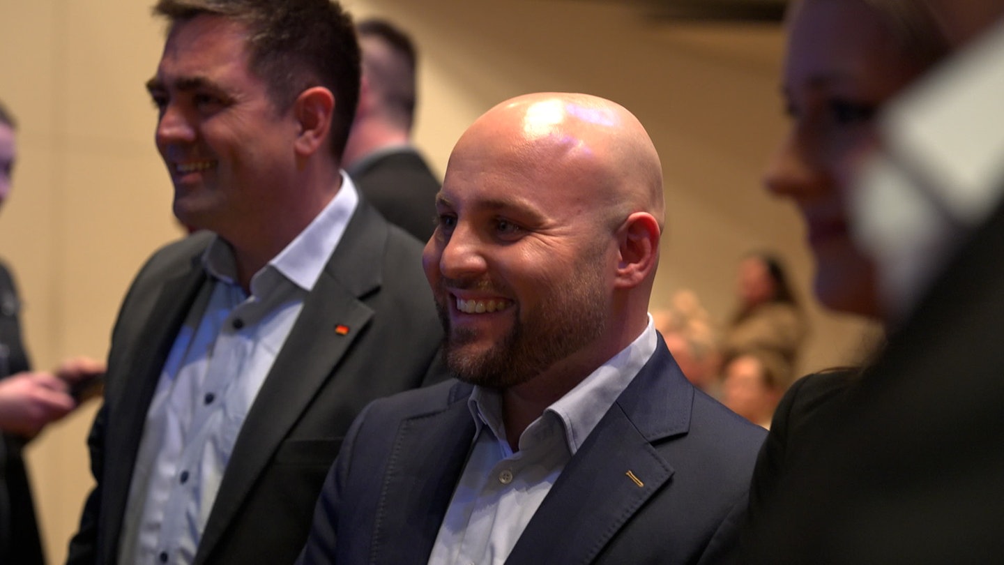Markus Frohnmaier ist im Wahlkampf-Modus. Der Landesvorsitzende der AfD in Baden-Württemberg wird bei seinen letzten Schritten zur Kulturhalle in Remchingen (Enzkreis) von "Nazis raus"-Rufen und Pfiffen begleitet. Der 33-Jährige dreht sich nochmal demonstrativ um und lächelt den Gegendemonstranten zu.