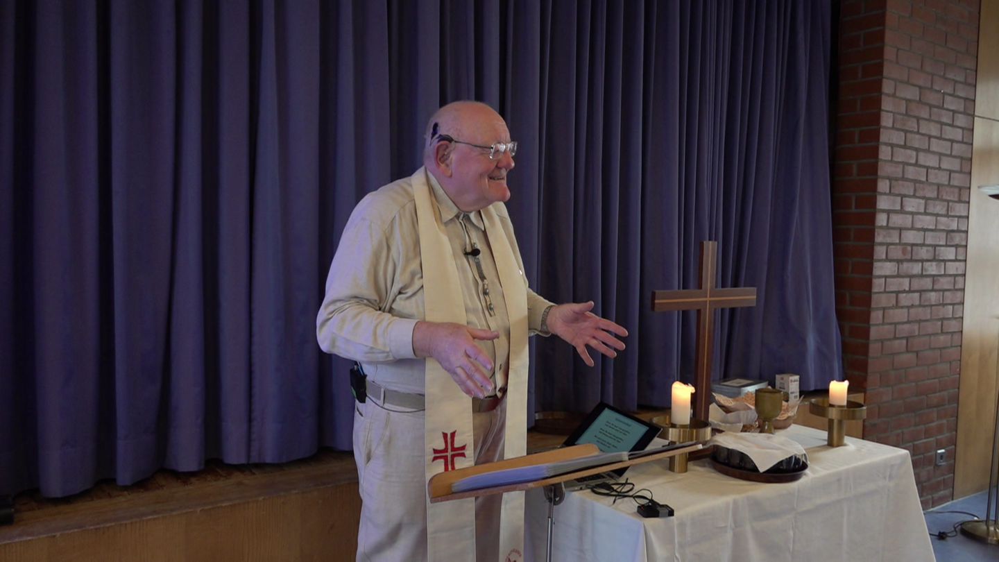 "Ich zeige zuerst", sagt Prädikant Stefan Heidland im kleinen Gemeindesaal in der Karlsruher Lukaskirche. Der ehrenamtliche Prediger leitet ein Lied ein. Das wird aber nicht gesungen. "Ich bin da. Das ist wahr. Das ist wunderbar", spricht er und gebärdet die Wörter gleichzeitig mit. Bei der Wiederholung machen auch die anderen in der kleinen Gemeinde mit. Denn an dem mit Kaffeetassen und Tellern gedeckten Tischreihen sitzen nicht nur Schwerhörige und Gehörlose. Beim Gottesdienst in der Karlsruher Lukaskirche ist jede und jeder willkommen.