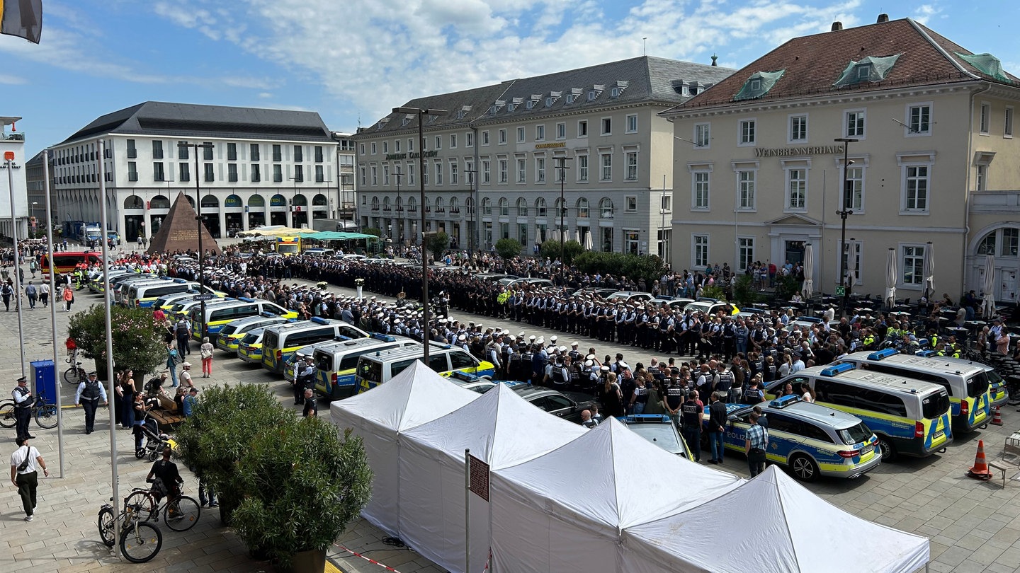 Trotz Hunderter Menschen war es am Freitagmittag auf dem Marktplatz in Karlsruhe sehr still. Rund 750 Polizistinnen und Polizisten des Polizeipräsidiums Karlsruhe hatte sich dort versammelt - um 11.34 Uhr gab es dann eine Schweigeminute. Damit wollten sie des Polizisten gedenken, der in Mannheim bei einem Messerangriff getötet wurde.