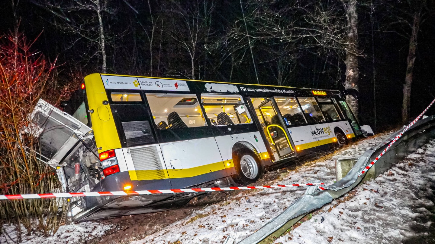 Ein Linienbus kam in der Nacht auf Freitag auf einer Landstraße bei Ebhausen (Kreis Calw) in einer Kurve ins Rutschen. Nach Polizeiangaben war die Straße glatt durch Schnee oder Eis. Der Bus kam von der Fahrbahn ab. Dann rutschte er rund fünf Meter eine Böschung hinunter und prallte gegen einen Baum.