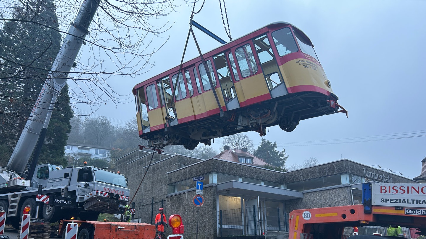 137 Jahre lang hat die Turmbergbahn Gäste auf den Karlsruher Hausberg und wieder hinunter befördert. Die rot-gelben, knapp acht Tonnen schweren Wagen waren seit rund 65 Jahren im Einsatz. Jetzt wurden sie abgebaut.