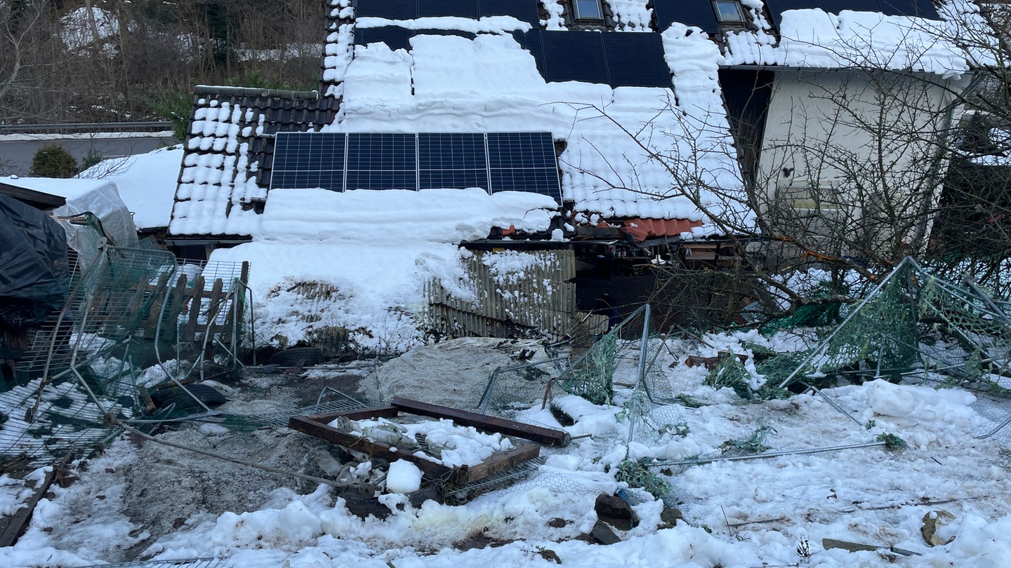 Der abgestürzte Schneepflug oberhalb der B462 im Forbacher Ortsteil Kirschbaumwasen (Kreis Rastatt) ist am Dienstag geborgen worden. Zurück blieb zunächst eine Ladung Streugut, ein verwüstetes Grundstück mit zerstörten Zäunen, sowie die teilweise beschädigte Garage unterhalb des Abhangs. Die Ermittlungen der Poilzei zum Unfallhergang laufen noch.
