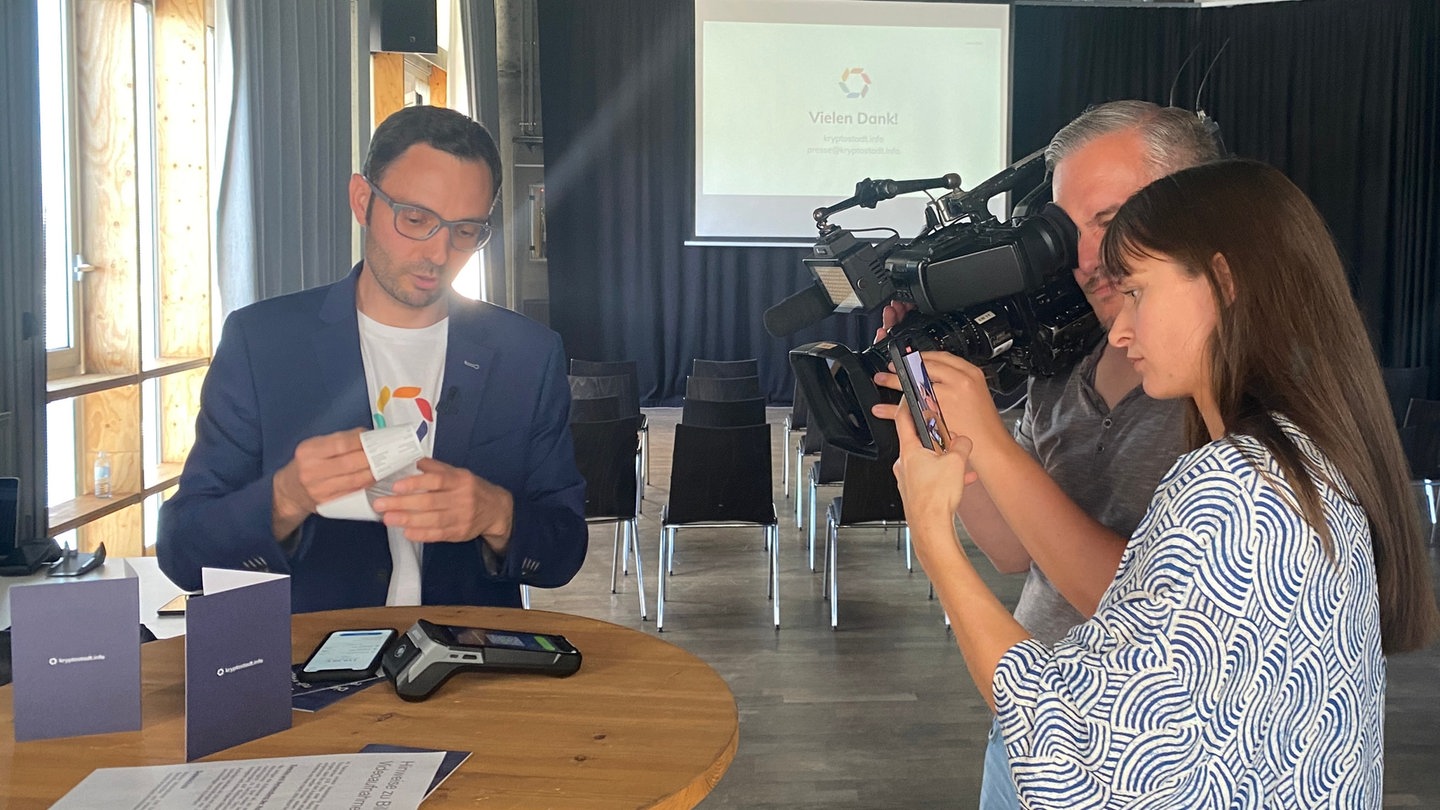 Einzelhändler, Gastronomen und Freizeitbetriebe sollen Kryptowährungen annehmen können - ohne selbst damit in Berührung zu kommen, so stellt es sich die Initiative Kryptostadt vor. Die Bezahlung läuft über eine App, die Kundinnen und Kunden auf dem Handy haben. Die Händler bekommen ein Krypto-Terminal. Das Personal vor Ort müsse dann nur einen Code einscannen und damit sei die Bezahlung abgeschlossen. Kosten entstehen angeblich für Kunden keine.