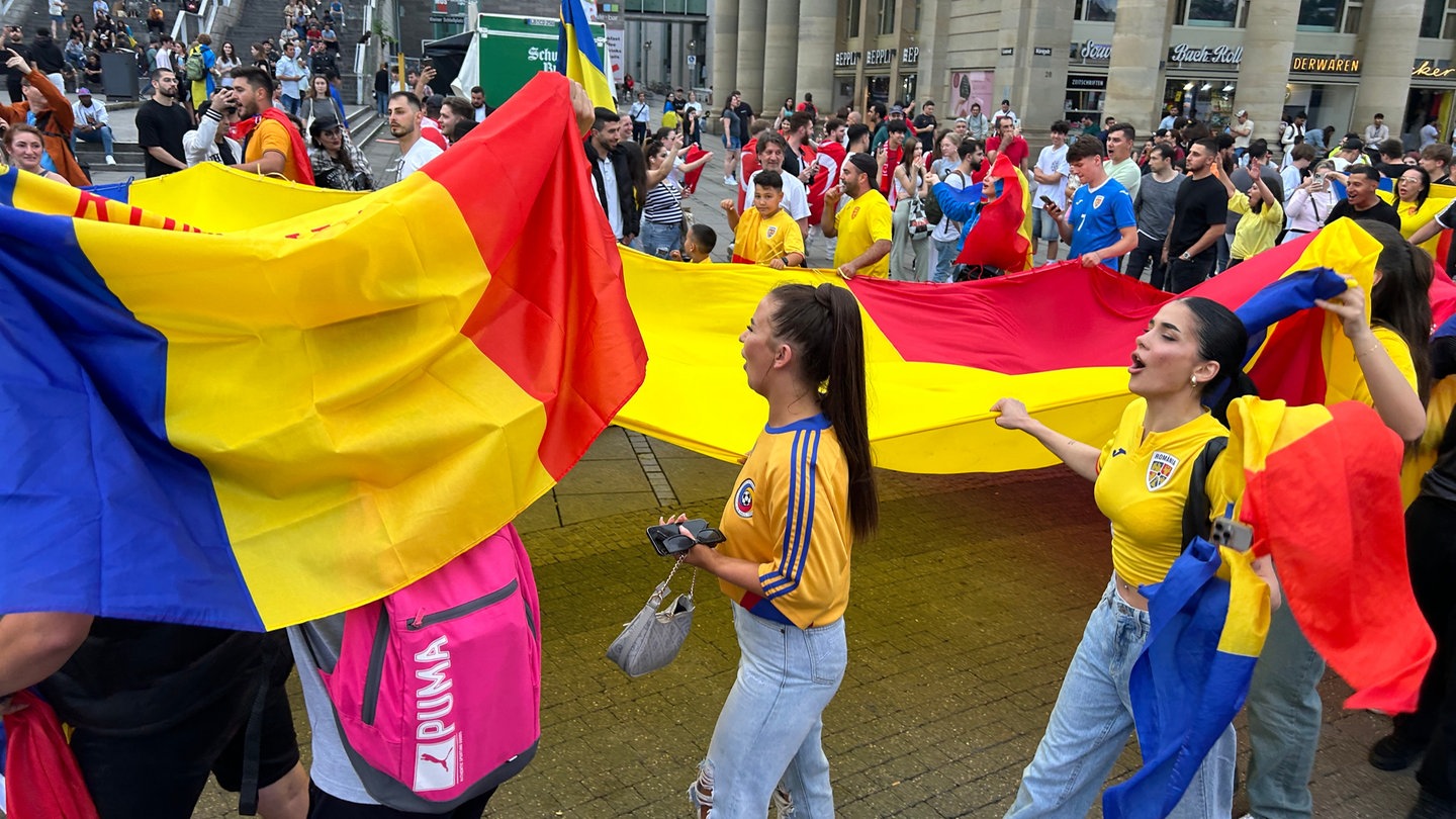 Auf der Königsstraße laufen traurig zwei verirrte Rumänien Fans herum. Sie wollten sich eigentlich das Spiel Slowakei - Rumänien anschauen. Das läuft ebenfalls parallel ab 18 Uhr, wird aber nicht auf dem Schlossplatz übertragen. Auch wenn sie noch schnell einen Ort zum Fußballschauen finden müssen, sind sie optimistisch: "2:1 für Rumänien", sagen sie.