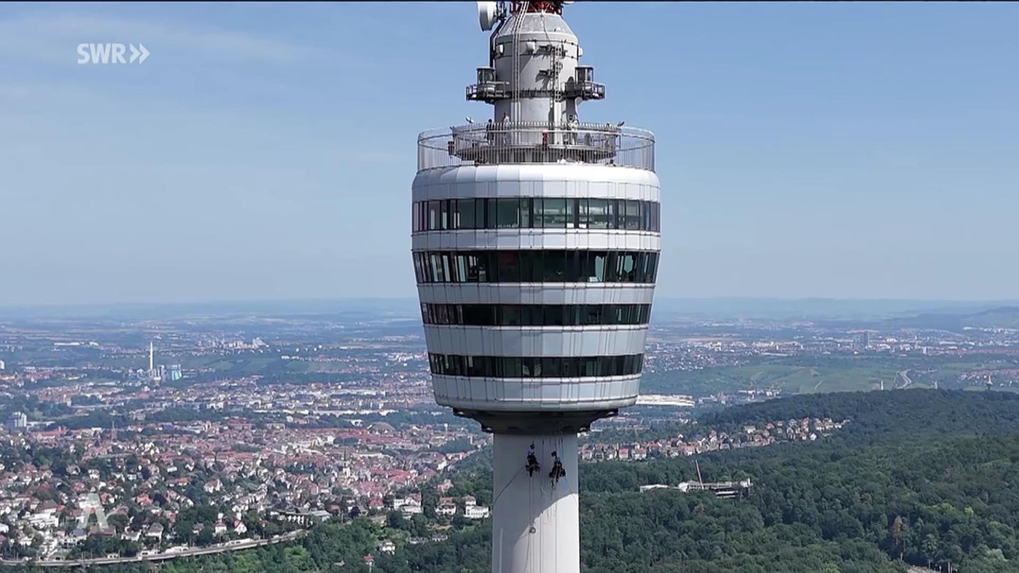 Drei Tage lang seilen sich Kletterer am SWR Fernsehturm hoch über Stuttgart ab, um die Bausubstanz für Instandhaltungsarbeiten zu prüfen. Klar ist: Es gibt kleine Risse im Beton.