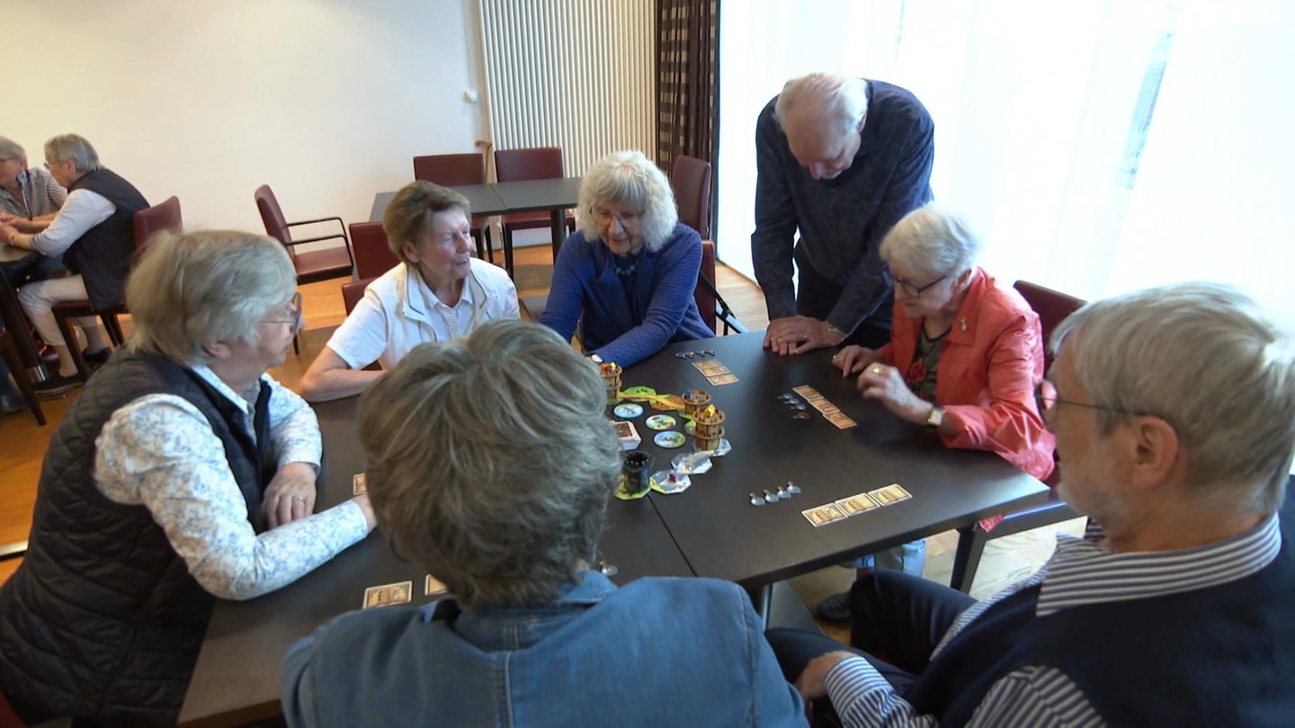 Es geht hinunter ins Erdgeschoss des Augustinums. Dort, in einem Veranstaltungsraum, kommen diesen Abend gut anderthalb Dutzend Mitbewohnerinnen und Mitbewohner der Kramers zusammen zum monatlichen Spieletreff. Die jüngsten sind etwa Mitte 70, die ältesten über 90 Jahre alt. Man siezt sich aus alter Gewohnheit. Drei Runden wird gespielt, die Runden sind gelöst und heiter. Ursula und Wolfgang Kramer betreuen je einen Tisch, den dritten betreut Doris Mörike, eine weitere passionierte Spielerin aus der Seniorenresidenz.