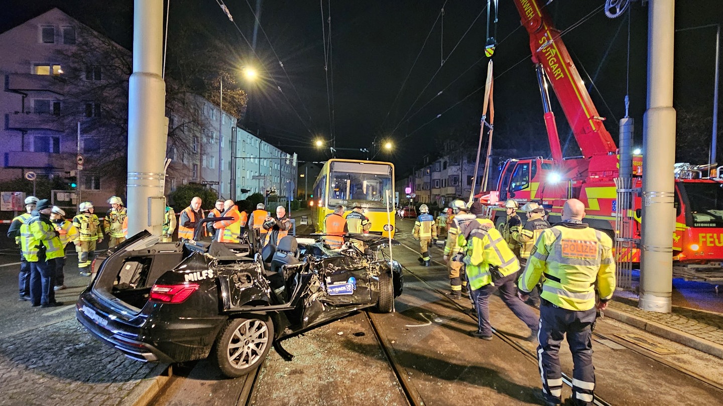 Feuerwehr muss Autofahrer nach Unfall mit Stadtbahn in Stuttgart aus Wagen befreien