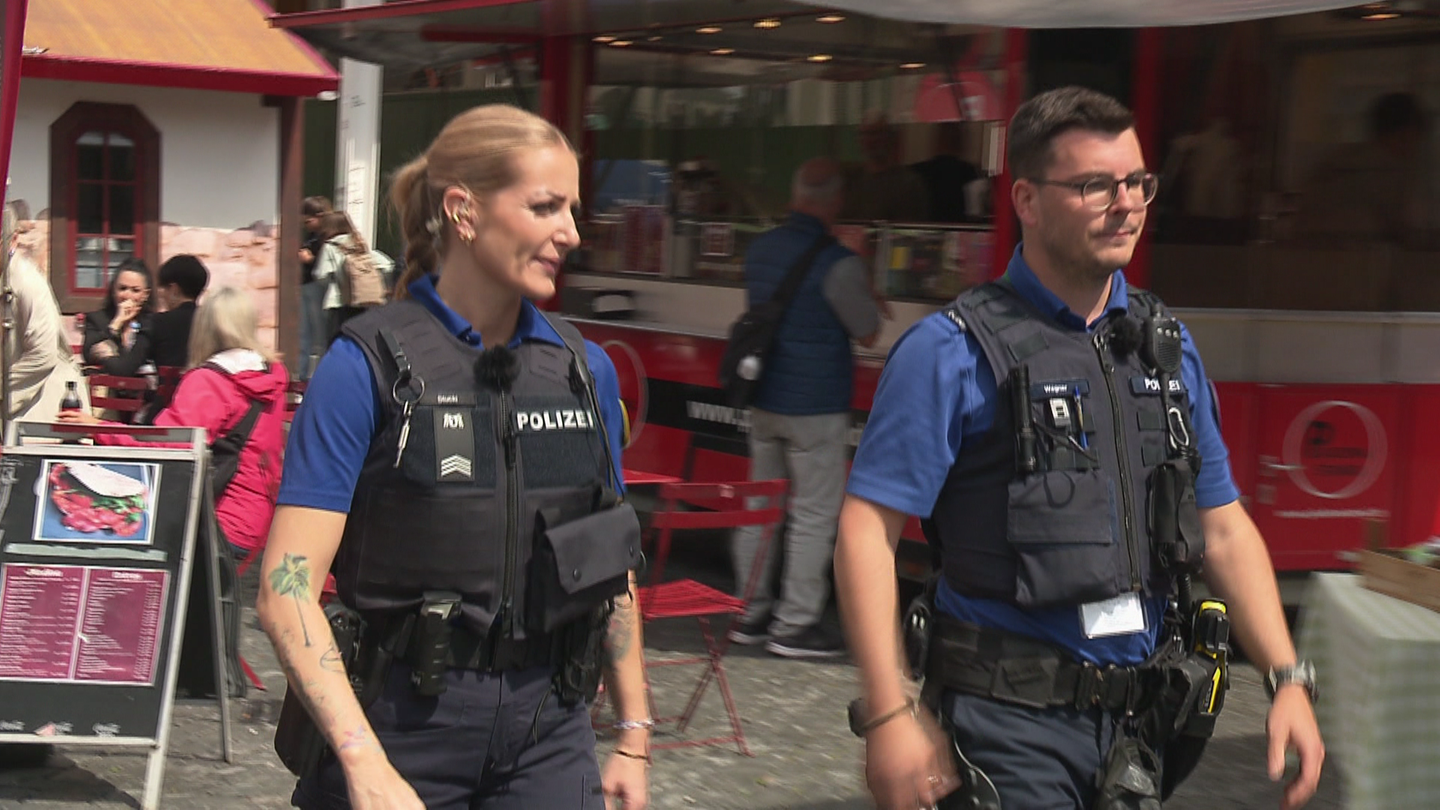 Tosca Stucki und Sandro Wagner sind zwei von insgesamt 1.300 Polizistinnen und Polizisten aus der ganzen Schweiz, die beim ESC in Basel im Einsatz sind. An diesem sonnigen Vormittag sind sie zu Fuß in der Innenstadt unterwegs, auf Patrouille. "Grundsätzlich schauen wir, ob irgendjemand Auffälliges herumläuft, und ob irgendwo verdächtige Gegenstände herumliegen", sagt Sandro Wagner von der Kantonspolizei Basel-Landschaft. Aber sie seien auch Ansprechpartner für die Bevölkerung und Touristinnen und Touristen, die Fragen haben.