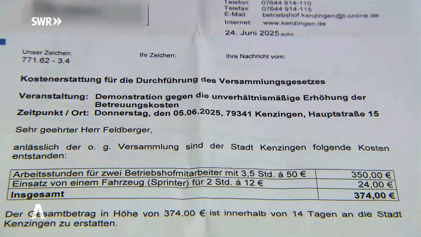 Alexander Feldberger staunte nicht schlecht, als Anfang Juni eine Rechnung der Stadt Kenzingen (Landkreis Emmendingen) in seinem Briefkasten landete. 374 Euro sollte der Familienvater bezahlen, wegen einer von ihm angemeldeten Demonstration vor dem Kenzinger Rathaus. Bei der Demo hatte Feldberger gemeinsam mit anderen Eltern gegen die Erhöhung der örtlichen Kinderbetreuungsgebühren protestiert. Diese sollten um bis zu 73 Prozent angehoben werden.