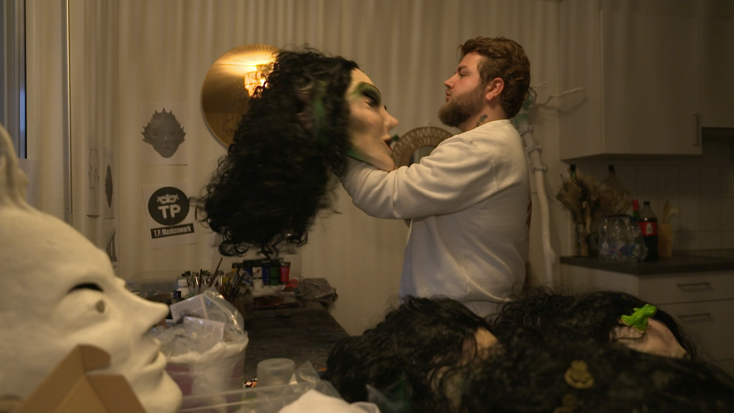 Während Masken in der alemannischen Fasnacht traditionell aus Holz geschnitzt werden, setzt Paulicke auf andere Materialien. In aufwendiger Handarbeit fertigte er die Masken aus Karton und Modelliermasse - jede einzelne bei sich zu Hause.