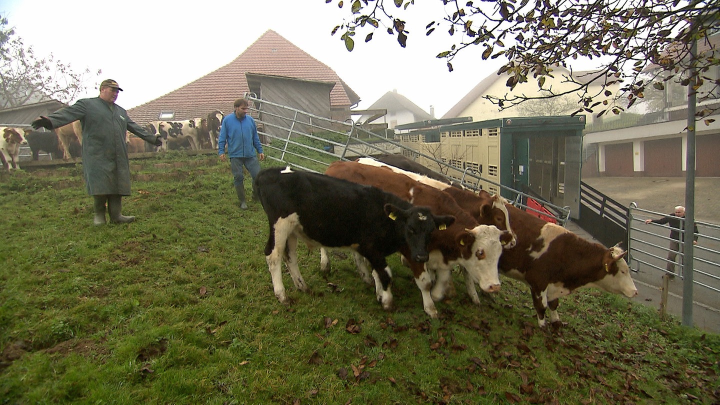 Für die Rinderherde von Landwirt Daniel Weiß geht es in die Winterferien. Er hält rund 50 Rinder im Schwarzwald auf 750 Metern Höhe in Gresgen in Zell im Wiesental (Kreis Lörrach). Wenn er auf seinen Flächen noch Winterfutter machen müsste, könnte er nur halb so viele Tier halten, sagt er. Außerdem wäre es deutlich teurer einen Stall auf dem Berg zu bauen als im Tal. Deshalb fährt er seine Rinder über den Winter lieber runter ins Tal - mit dem Lkw. Die Kuh-Pension lässt sich der Bergbauer zwar mehrere Tausend Euro kosten, dafür spart er sich Winterfutter, Stall und Arbeitszeit.