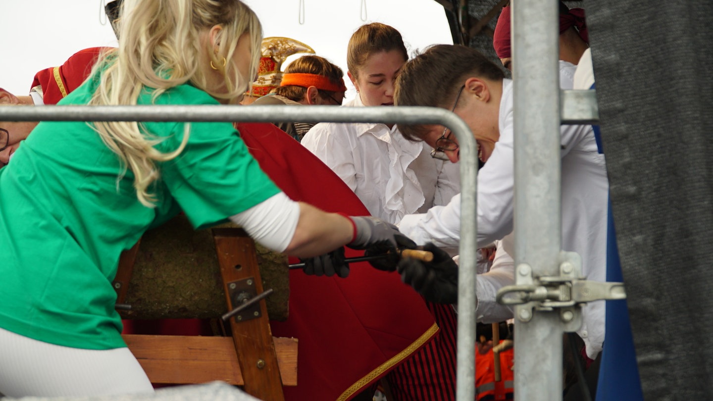 Das ist gar nicht so einfach: Der Stamm ist etwa 40 Zentimeter lang, mit einem Handbohrer wird gebohrt. Laut Steffen May, Präsident der Narrenzunft Deichelmaus, braucht es viel Technik, um schnell durch den Stamm zu kommen. Der Ehrgeiz ist groß, immerhin geht es um nichts Geringeres als die Ehre: Lehrerinnen und Lehrer werden von etwa 1.000 Schülerinnen und Schülern angefeuert. Wer gewinnt, bekommt den Pokal.