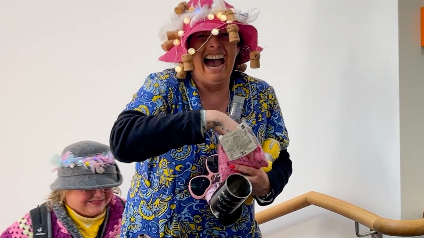Ein gutes Dutzend "Kittelschürzen" aus Unterjesingen hat am Nachmittag das SWR-Studio in Tübingen besucht. Mit Konfetti, Seifenblasen, Süßem und guter Laune hat die Gruppe die Redaktion aufgemischt.