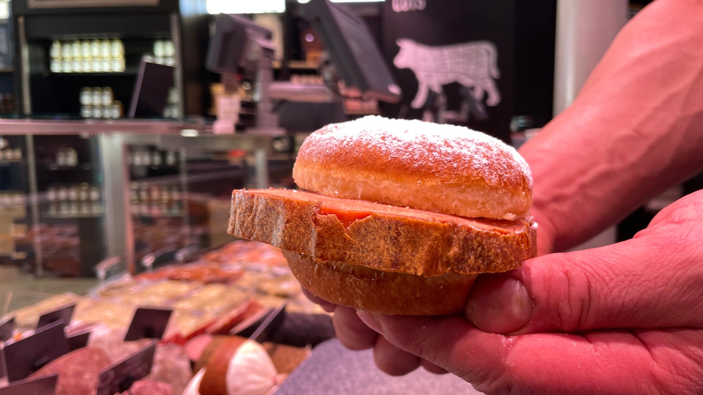 Zur Fasnet gibt es bei Metzgermeister und Fleisch-Sommelier Patrick Holzapfel in Mössingen (Kreis Tübingen) den guten alten Leberkäse in außergewöhnlicher Kombination. Hinter dem "Fasnets-Fleischkäse", den die Metzgerei zur Zeit anbietet, verbirgt sich ein Leberkäse im süßen Berliner, natürlich gefüllt mit Marmelade.