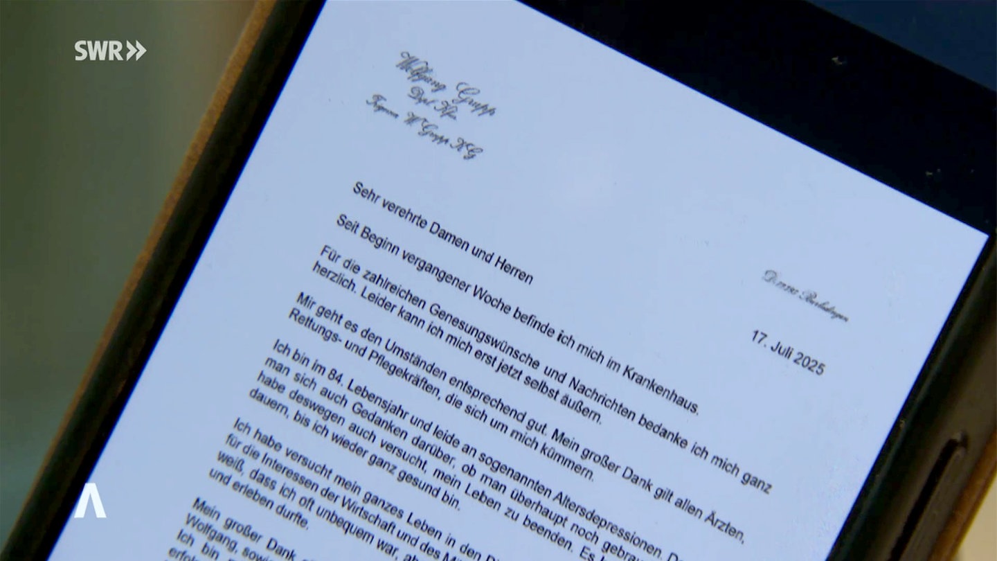 Der Ex-Chef der Firma Trigema in Burladingen (Zollernalbkreis) hat nach eigenen Angaben versucht Suizid zu begehen. Dem SWR liegt ein Brief vor, in dem Wolfgang Grupp senior mitteilt, er leide an Altersdepressionen und habe deshalb nicht mehr leben wollen. Inzwischen bedauere er, was geschehen ist. Zuerst hatten die "Bild"-Zeitung und die Deutsche Presse-Agentur berichtet.