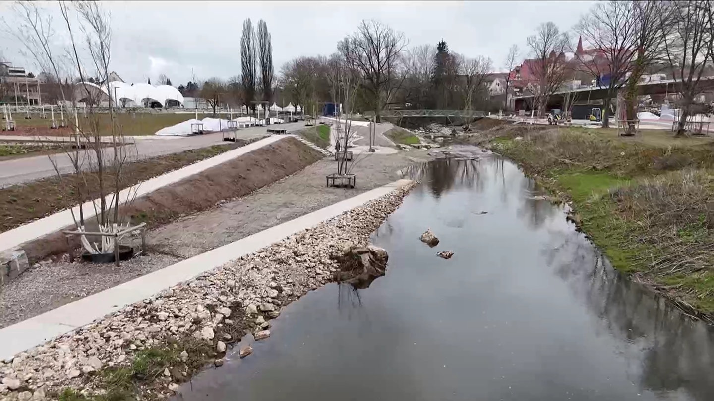 Powolny zeigt auf die andere Seite Richtung Gartenschau-Eingang: "Früher war hier der Schießwasen, eine riesige Asphaltfläche." Heute ist die Fläche ein grüner Stadtpark. Es ist ein 26 Hektar großes Gelände rund um die Jagst entstanden, das ab dem 24. April als Landesgartenschau Ellwangen 2026 eröffnet wird. Dafür müssen nur noch die Bagger und die Matschwege verschwinden und das Wetter besser werden.