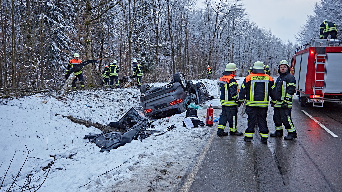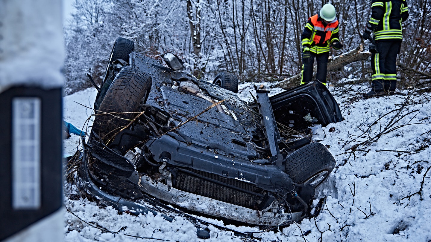 Offenbar prallte der junge Mann mit seinem Auto gegen einen Baum, bevor der Wagen neben der Fahrbahn auf dem Dach liegen blieb. Ob Schnee- und Eisglätte den Unfall auslöste, konnte die Polizei nicht sagen. Es herrschten winterliche Straßenverhältnisse.