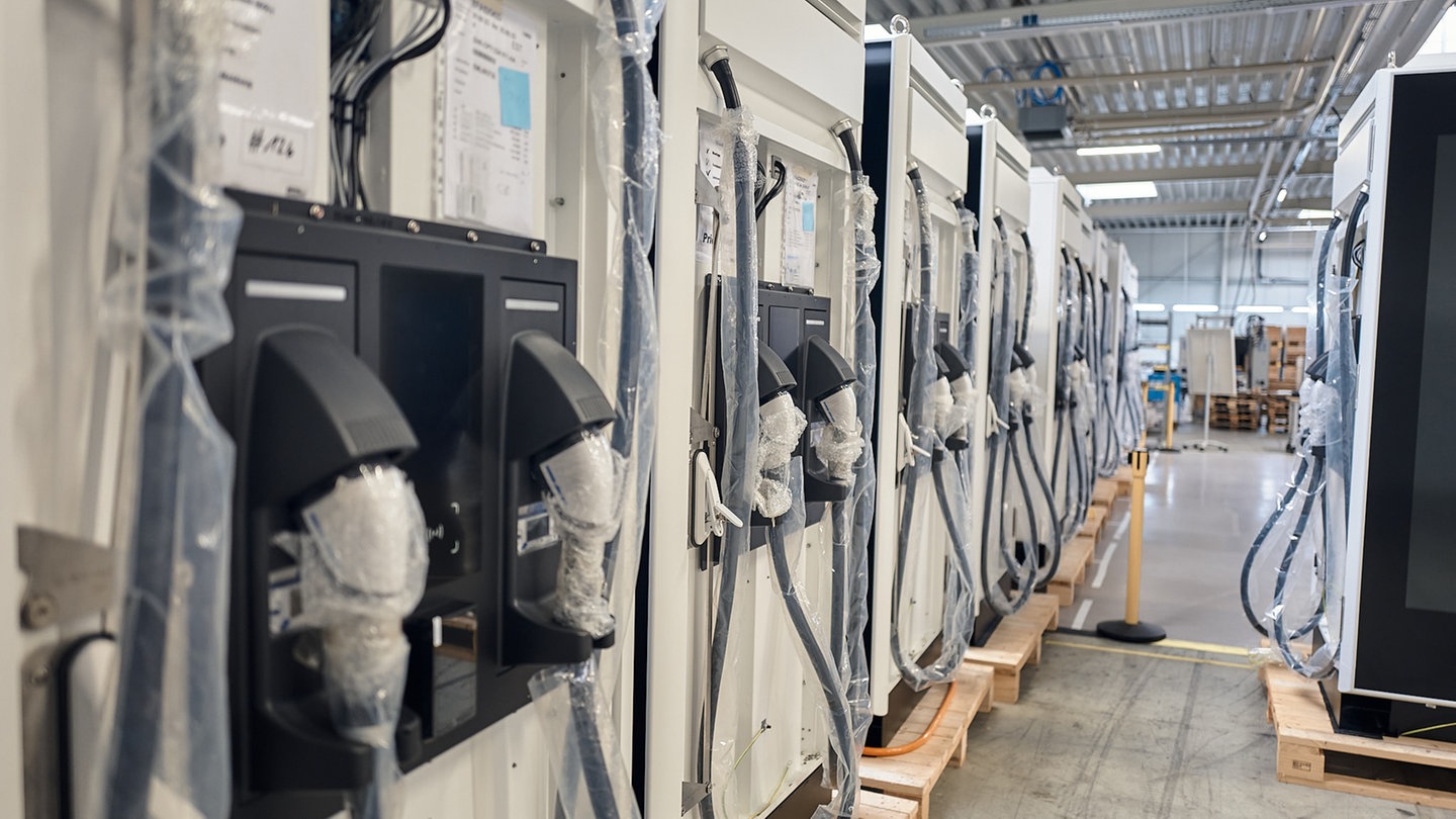 Dafür hat der Chef des Unternehmens ads-tec in Nürtingen bei Stuttgart ein ultraschnelles Ladesystem entwickelt - nach dem System eines WC-Spülkastens. Statt nur das bisschen Leistung aus dem Stromnetz, kann so "die geballte Ladung" aus dem Speicher genutzt werden, erklärt Thomas Speidel. Die batteriegepufferten Schnelllader könnten flexibel an Straßen und Firmengebäuden, in Wohngebieten ohne Garagen oder Wallboxen aufgestellt werden. Wird ein E-Fahrzeug angedockt, ist es binnen Minuten strombetankt.