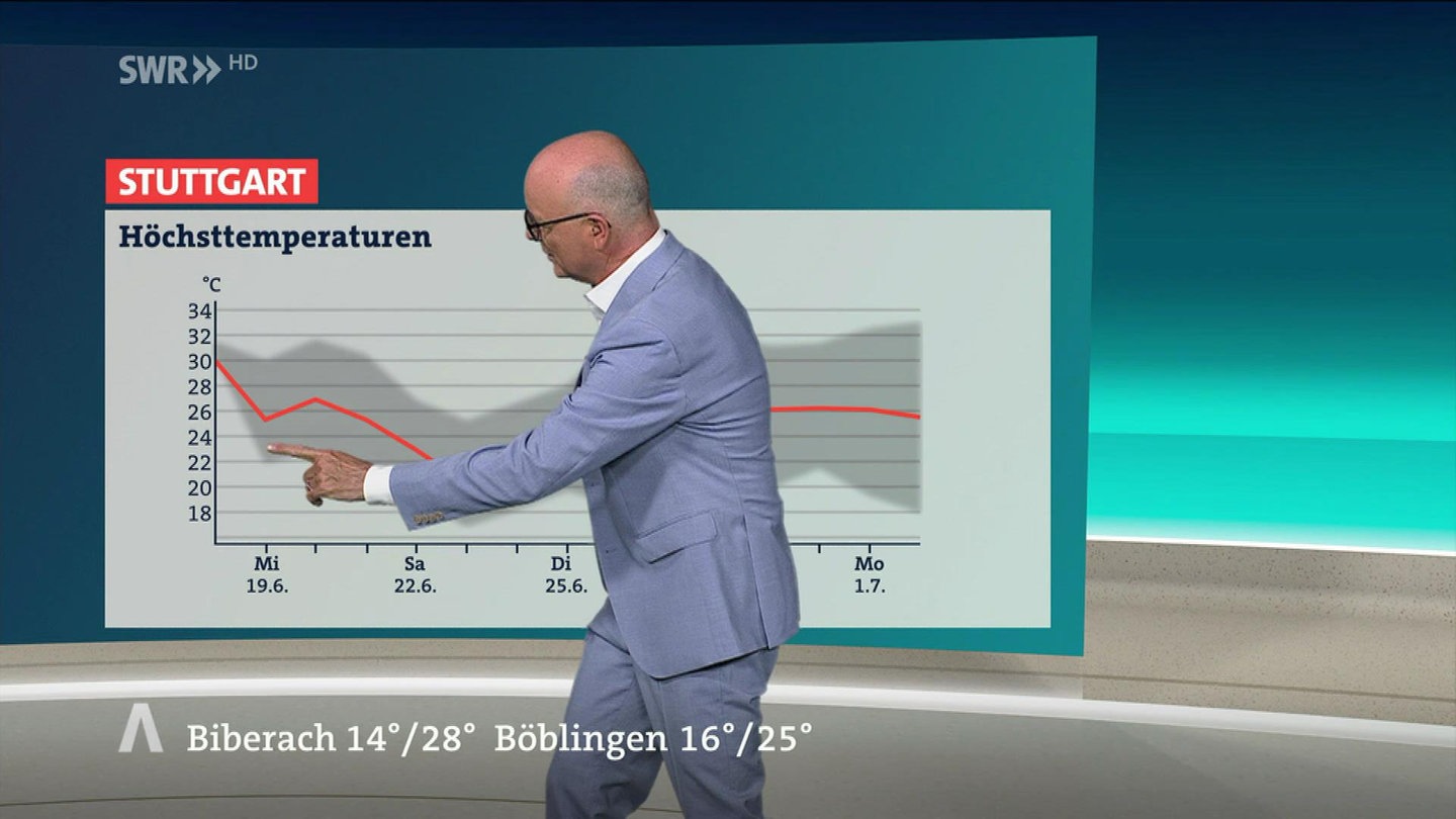 Nach dem sehr warmen Dienstag in Baden-Württemberg sinken die Höchstwerte wieder etwas: Am Mittwoch werden im Norden des Landes 23 bis 25 Grad, ansonsten 26 bis 28 Grad erreicht. Am Vormittag ist das Wetter zunächst noch dreigeteilt: Im Norden gibt es noch Schauer, in der Landesmitte ist es trocken, aber eher bewölkt, im Süden scheint die Sonne. Am Nachmittag ziehen sich die Schauer nach Nordosten zurück, gegen Abend ist es überall weitgehend trocken und die Sonne zeigt sich.