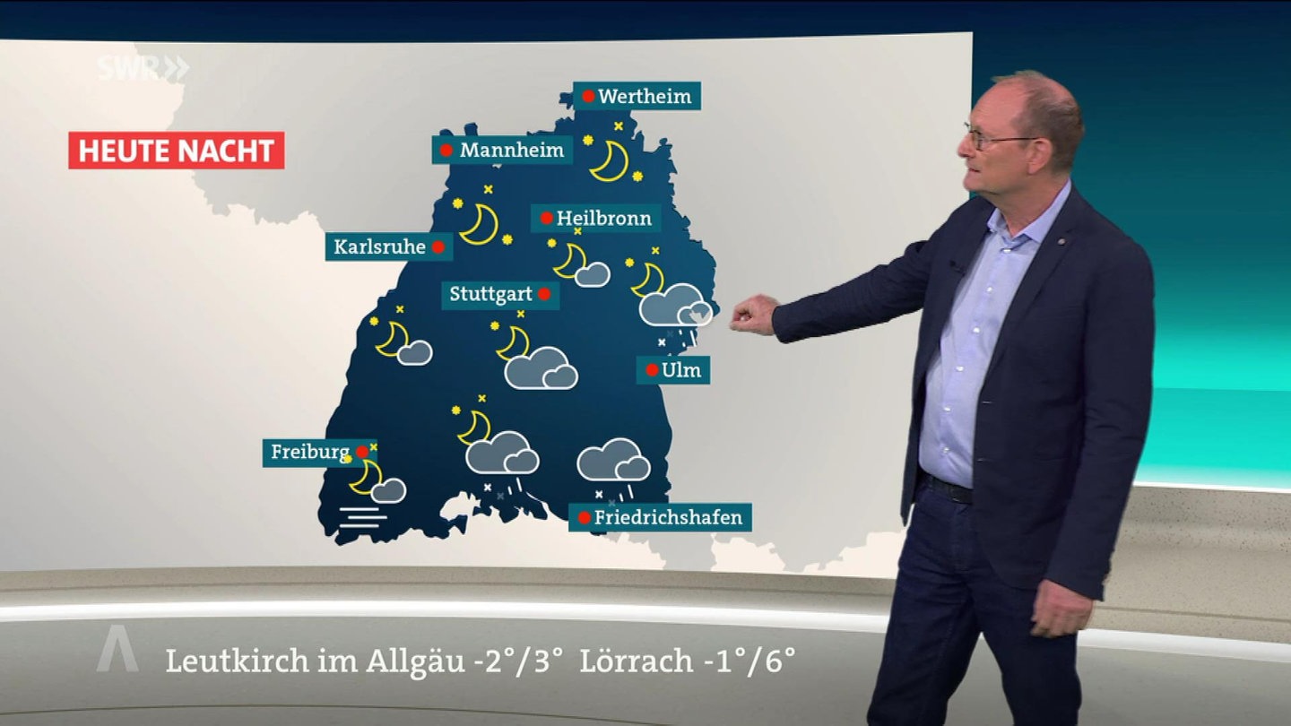 In der Nacht zum Donnerstag rechnet SWR-Wetterexperte Mühlbauer erneut mit Niederschlägen, in den Höhenlagen auch mit Schnee. Es könne durchaus sein, dass es dann auch in tieferen Lagen zumindest ein bisschen schneie, klar sei das aber noch nicht. Die Temperaturen sinken in den Niederungen auf 4 bis minus 2 Grad. Auch tagsüber bleibt es laut Prognose stark bewölkt und zeitweise nass. Ab den mittleren Lagen führe das zu Schnee oder Schneeregen.
