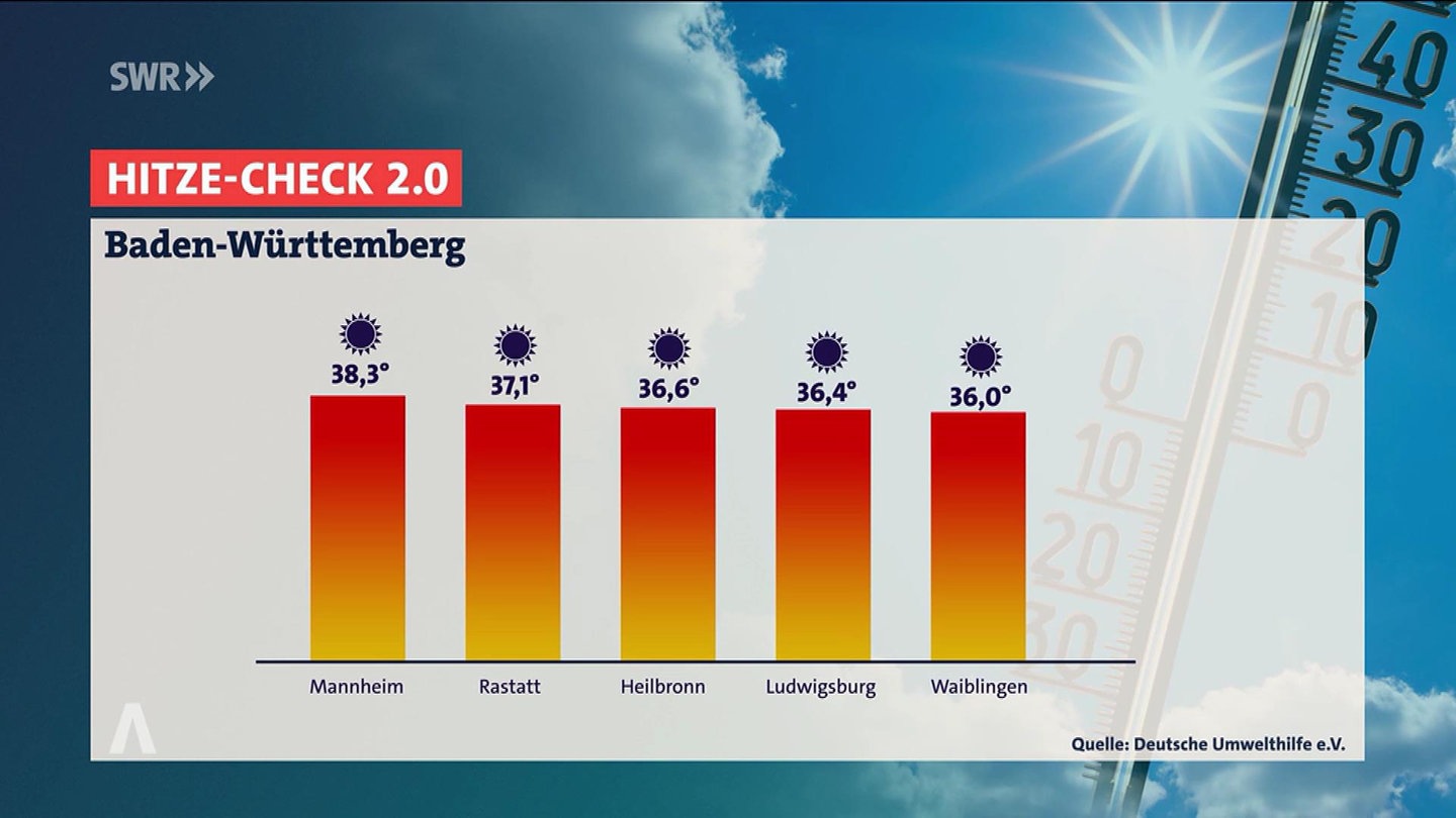 Vor allem trifft das auf Städte in Baden-Württemberg und Rheinland-Pfalz zu, wie der neueste Hitze-Check der Umwelthilfe belegt. Dieser zeigt, wo Menschen besonders stark durch Hitze belastet sind.