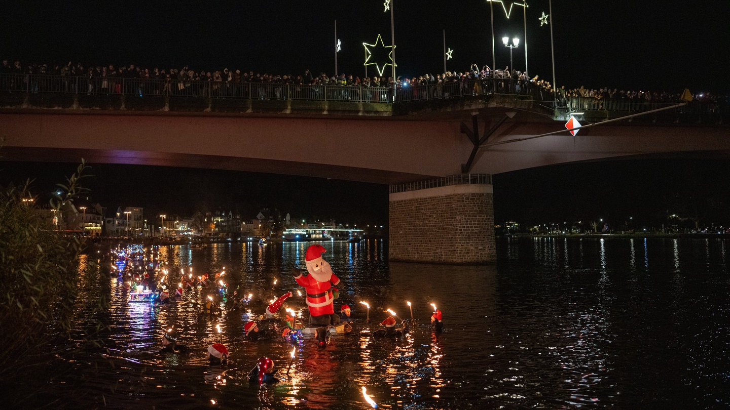 Das Fackelschwimmen in Bernkastel-Kues zieht jedes Jahr tausende Zuschauer an die Mosel. Es findet am Nikolaustag statt, also an einem Datum, an dem die Mosel nicht wirklich zum Schwimmen einlädt. Etwa 100 wagemutige Schwimmerinnen und Schwimmer in Tauchanzügen stürzten sich dabei in diesem Jahr in die kalte und dunkle Mosel, um einen Nikolaus in einem Boot zu begleiten. Sie starten am Stadtrand und schwimmen mit brennenden Fackeln in der Hand bis zur Altstadt oder lassen sich einfach treiben. Immerhin ist die Strecke mehr als einen Kilometer lang. Das Fackelschwimmen zählt seit mehr als 40 Jahren zu den Hauptattraktionen des Weihnachtsmarktes in Bernkastel-Kues und ist inzwischen dort eine ziemliche Gaudi.