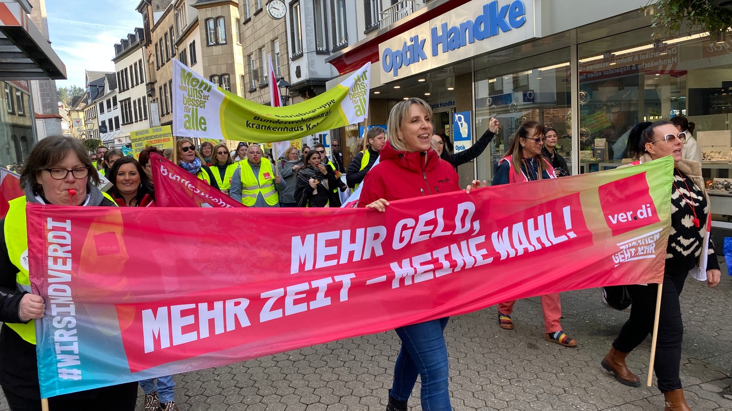 "Mir hätte das wirklich ganz viel geholfen", sagt Silke Präfke. Dann hält sie bei der Ver.di-Demo in Mayen eine kämpferische Rede. Denn das Angebot der Arbeitgeber bei den laufenden Tarifverhandlungen im öffentlichen Dienst sei ein Witz.