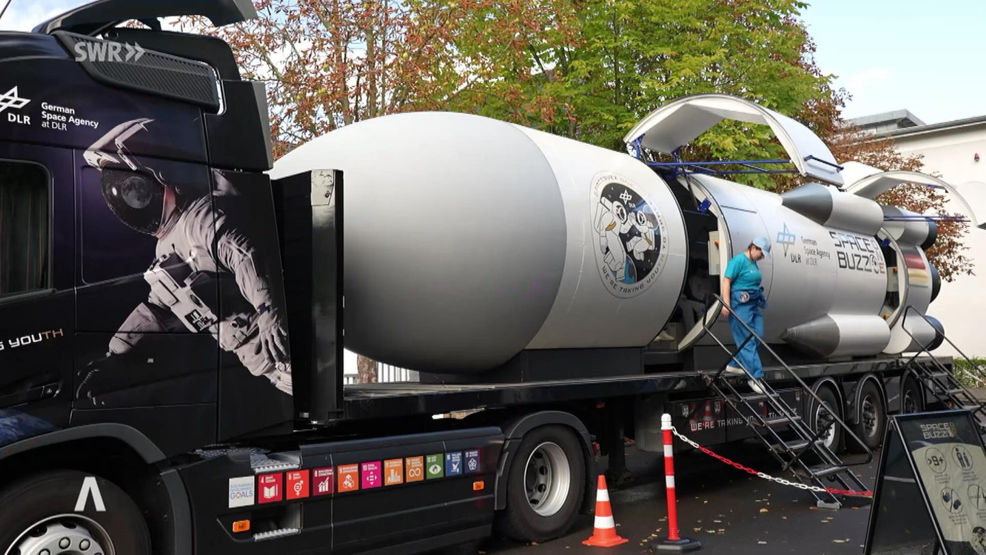 Die "Spacebuzz One" ist auf dem Schulhof der IGS Betzdorf-Kirchen gelandet. Das ist zwar keine echte Rakete, aber ein spektakuläres Modell, das auf einem großen, futuristischen Lkw liegt. Der gehört zum Deutschen Zentrum für Luft- und Raumfahrt und tourt durch Deutschland.