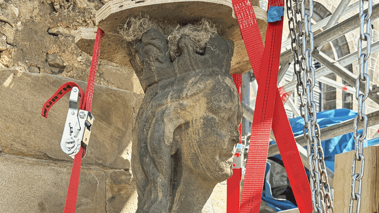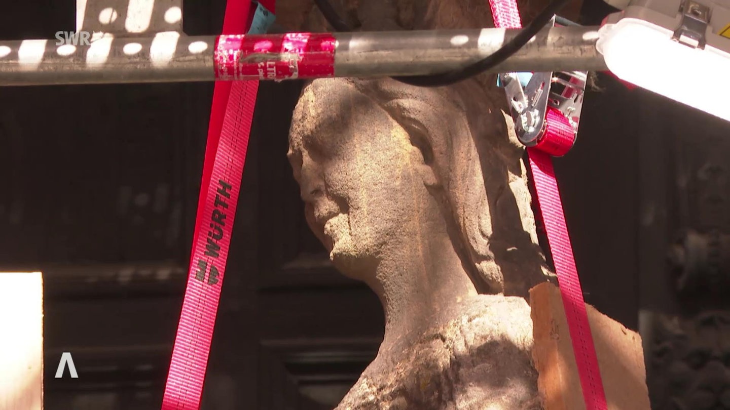 Es dauerte fast eine Stunde, dann war es geschafft: Zentimeter um Zentimeter wurde die Ecclesia-Figur aus 16 Metern Höhe herabgelassen. Sie steht nun im Inneren des Wormser Doms. Dort soll die etwa 700 Jahre alte Figur restauriert werden.
