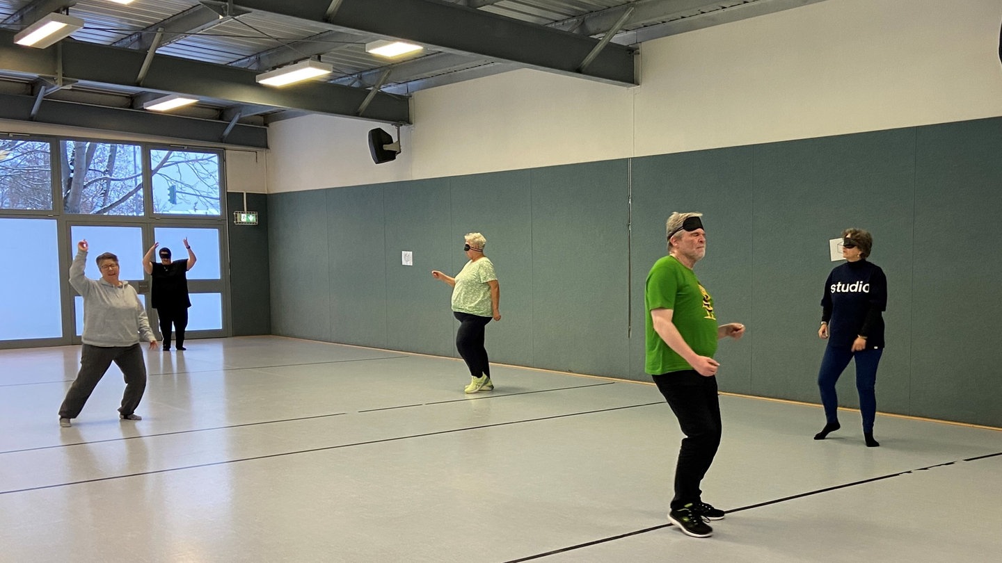 Die Wissenschaftlerin Luisa Heyn verteilt Augenbinden und die neun Teilnehmenden stellen sich in der Turnhalle auf dem Campus der Johannes Gutenberg-Universität auf. "Jeder schaut bitte, wie viel Platz ihr habt, damit niemand gegen die Wand läuft", sagt sie. Dann schaltet sie die Musik an. Material Girl von Madonna kommt laut aus der großen Box.