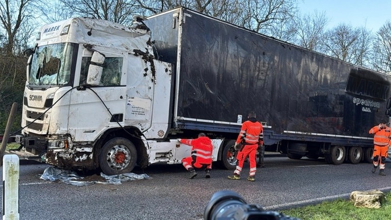Für die Bergung des Lasters musste ein Abschleppunternehmen mit einem speziellen Kran angefordert werden. Der konnte den Sattelschlepper schließlich aufrichten und auf einen nahegelegenen Parkplatz schleppen.