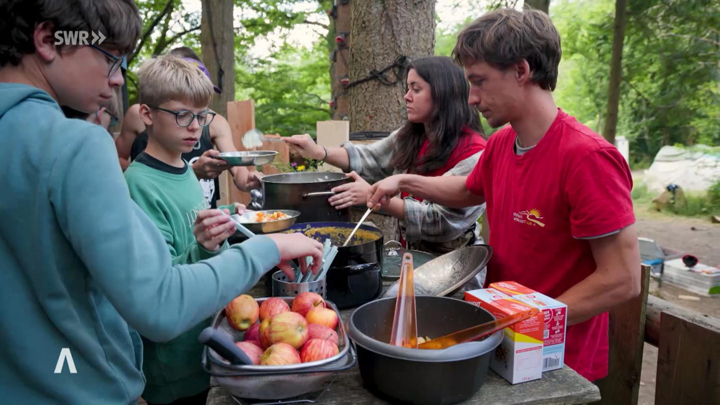Linus ist schon von Anfang an immer wieder bei dem Projekt mit dabei. Ihm gefällt besonders, in der Natur zu sein und dass "man halt auch bauen kann, so wie man's will". Pro Tag dürfen die Jugendlichen eine halbe Stunde ans Handy. Das reicht auch, findet Linus. Netz gebe es sowieso kaum, außerdem mache man so mehr in der Gruppe. Wenn mal nicht gebaut wird, werden nämlich Spiele gespielt, gewandert oder zusammen gekocht und gegrillt.