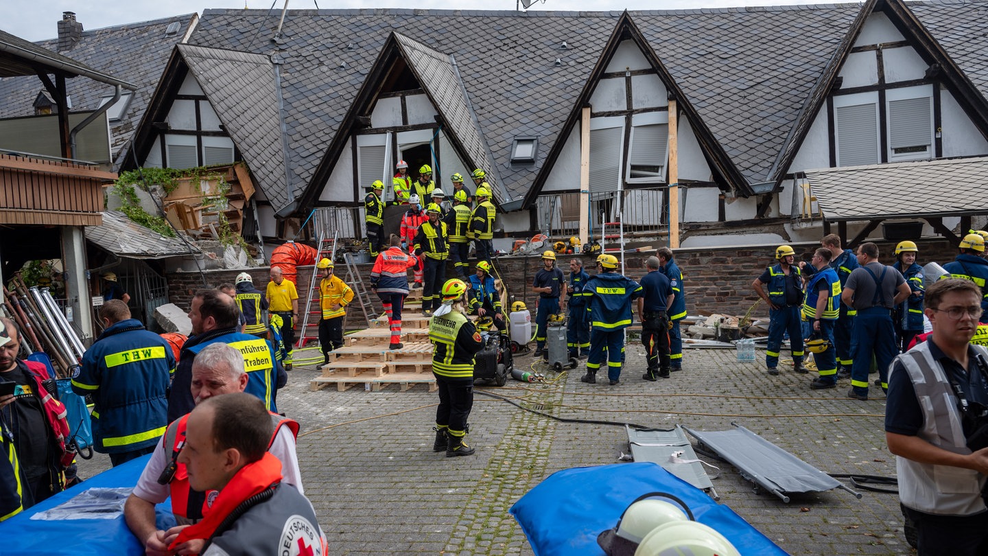 Bei dem Hoteleinsturz am 6. August 2024 in Kröv an der Mosel waren mehrere Menschen unter den Trümmern begraben. Zwei starben, darunter der Hotelbesitzer. Bei der 24-stündigen Rettungsaktion waren rund 250 Einsatzkräfte dabei.